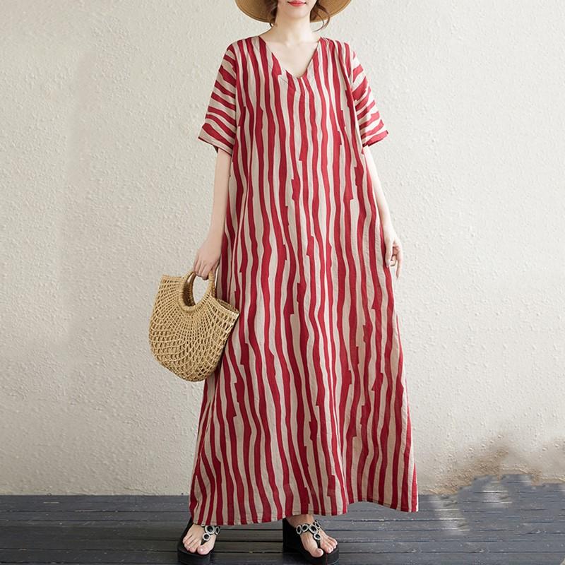 Новое хлопковое винтажное платье в полоску с коротким рукавом больших размеров для женщин, повседневное свободное длинное летнее платье — купить товар онлайн с бесплатной доставкой по всему миру!