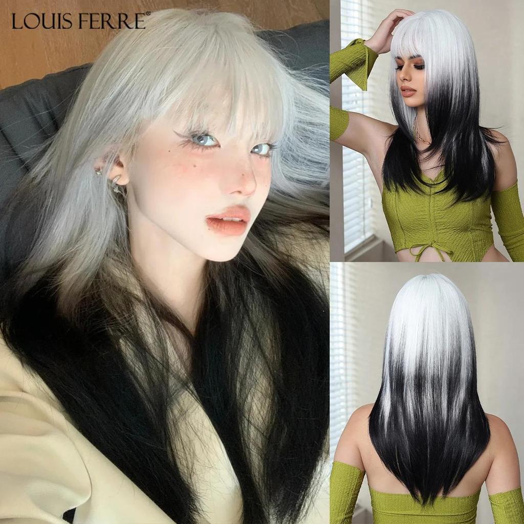 LOUIS FERRE Длинные прямые синтетические парики для женщин, белые, черные многослойные волосы с челкой, парики из термостойкого волокна на каждый день