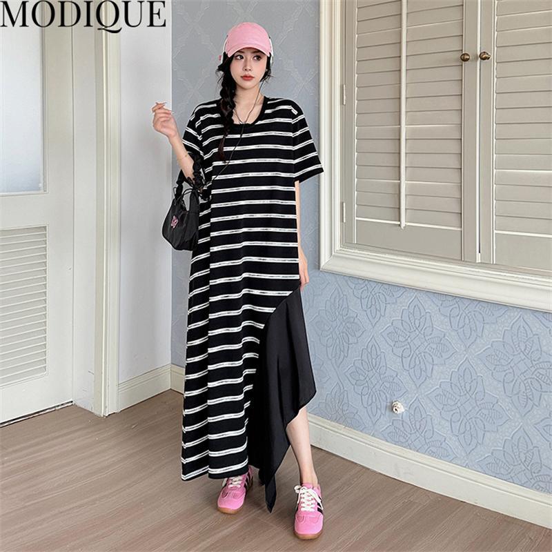 MODIQUE Лето Плюс Размер Женщины Свободные Универсальные Черно-Белые Полосы Лоскутные Длинные Платья Женские Повседневные Платья С Коротким Рукавом U-образным Вырезом