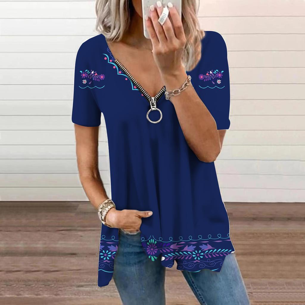 Женский топ, летний новый модный коричневый цветочный принт, повседневный топ на молнии с v-образным вырезом и короткими рукавами