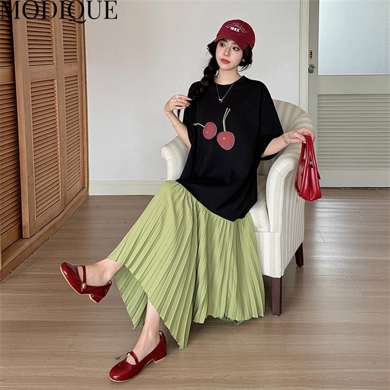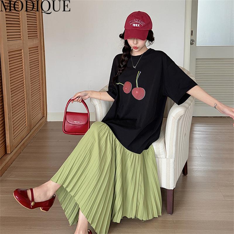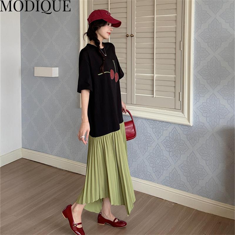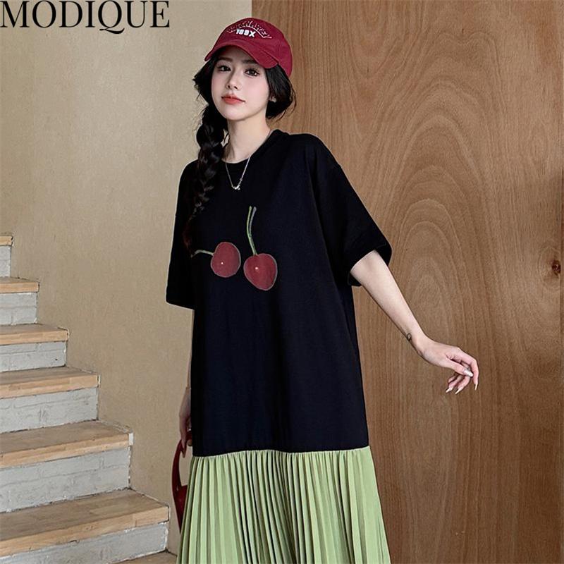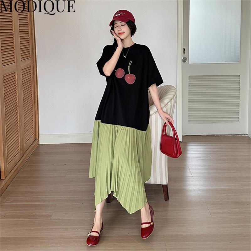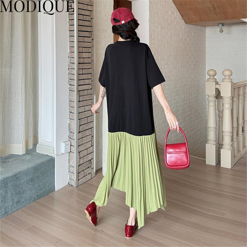 MODIQUE Лето Плюс Размер Женщины Свободные Универсальный Принт Лоскутная Плиссированная Хлопковая Футболка Длинные Платья Женские Повседневные Платья С Коротким Рукавом О-Образным Вырезом