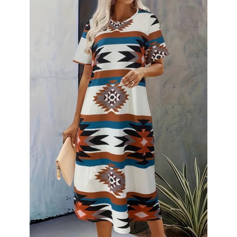 Платье с круглым вырезом с геопринтом, повседневное платье с короткими рукавами на весну и лето, женская одежда — купить товар онлайн с бесплатной доставкой по всему миру!