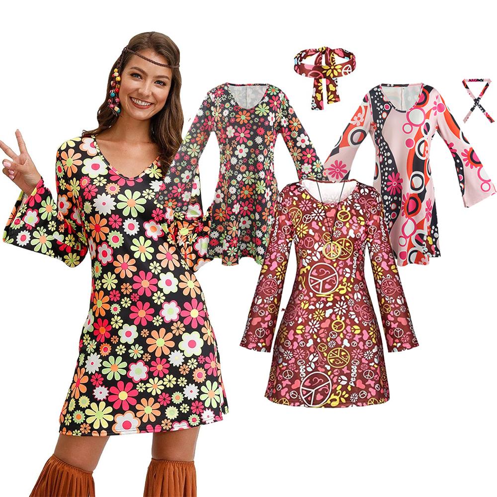 Женский костюм хиппи, карнавальная вечеринка, дискотека, танцевальный костюм 70-х годов, комплект с повязкой на голову, платье