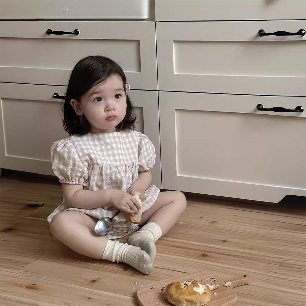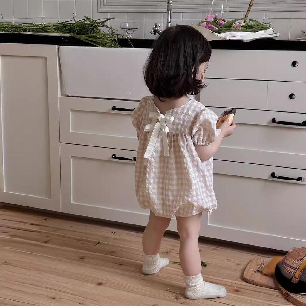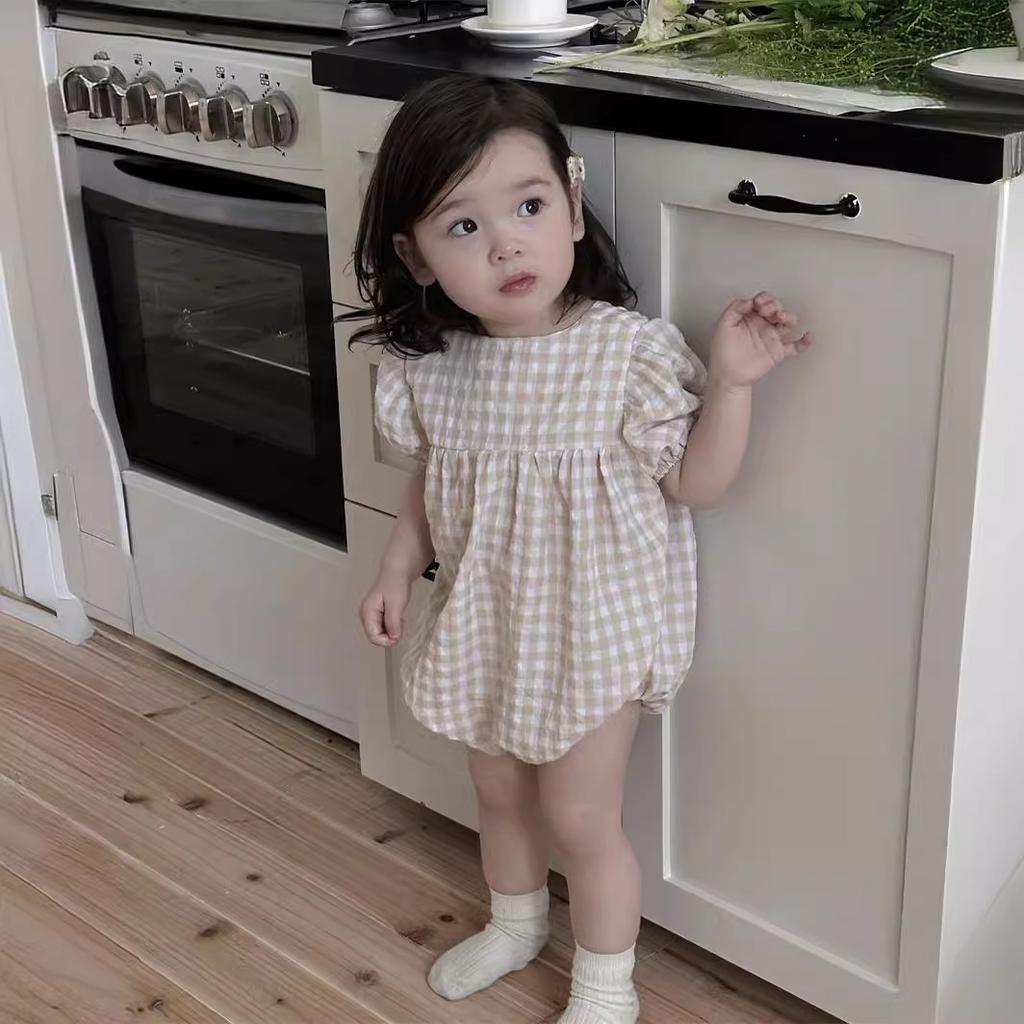 Летний комбинезон в клетку для маленьких девочек с тонкими пышными рукавами, свободный хлопковый повседневный комбинезон для новорожденных девочек, комбинезон для младенцев, детская одежда