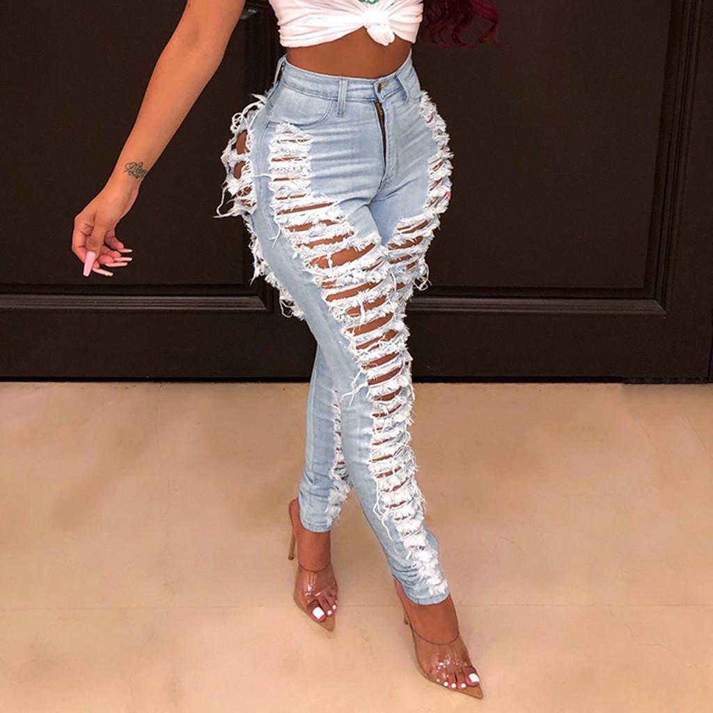 Женские джинсы с дырками и карманами на молнии, повседневные джинсовые узкие узкие брюки-карандаш