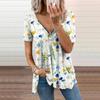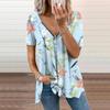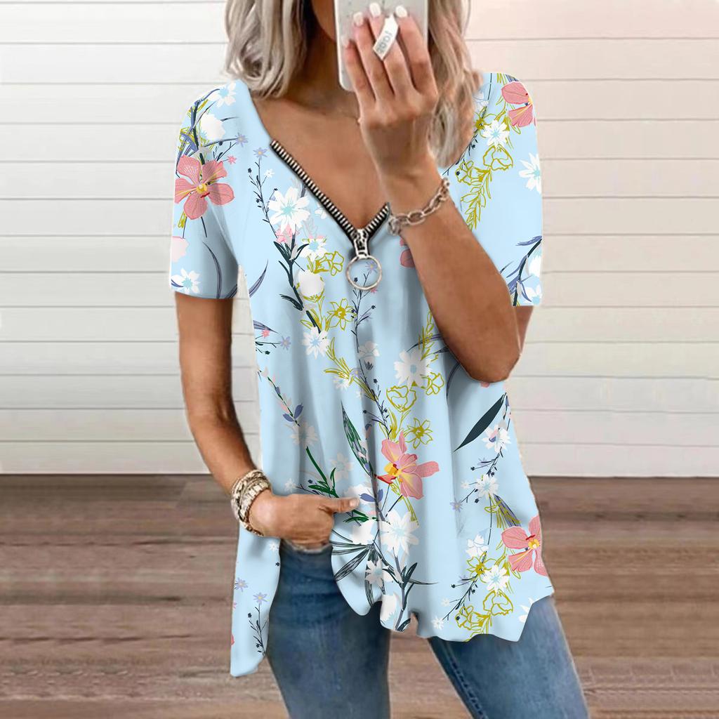 Женский топ, летний новый модный синий полый топ с цветочным принтом, повседневный топ на молнии с v-образным вырезом и короткими рукавами