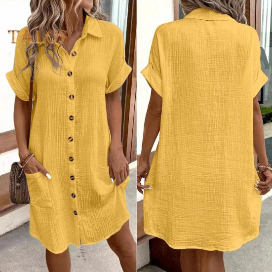 Летнее женское платье с отложным воротником, однобортное, свободное, с короткими рукавами, свободное, однотонное, с накладным карманом, длиной до колена, для отдыха, миди-платье — купить товар онлайн с бесплатной доставкой до всему миру!