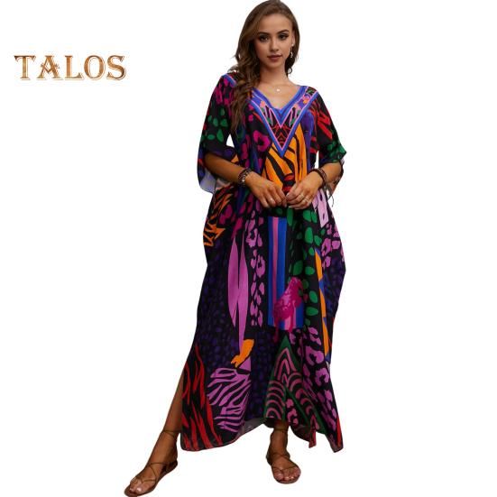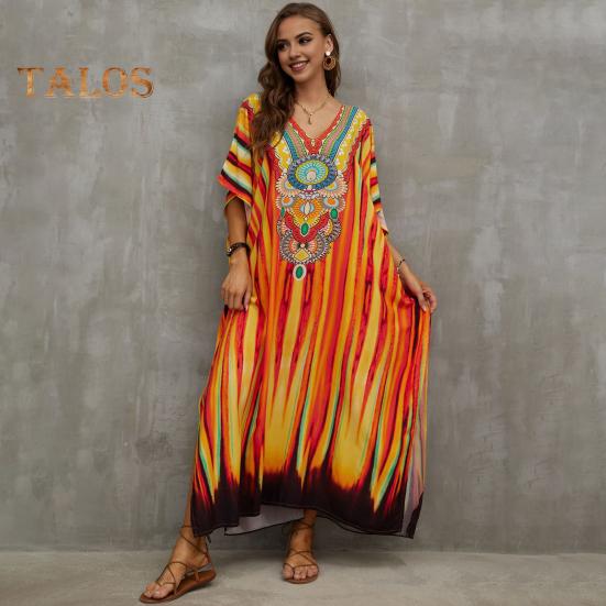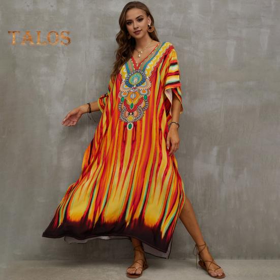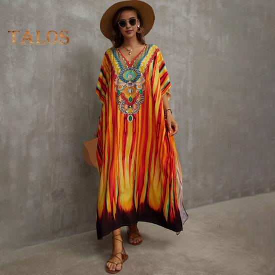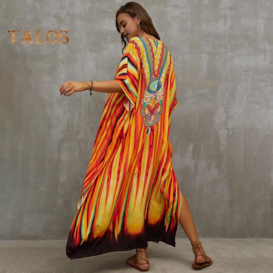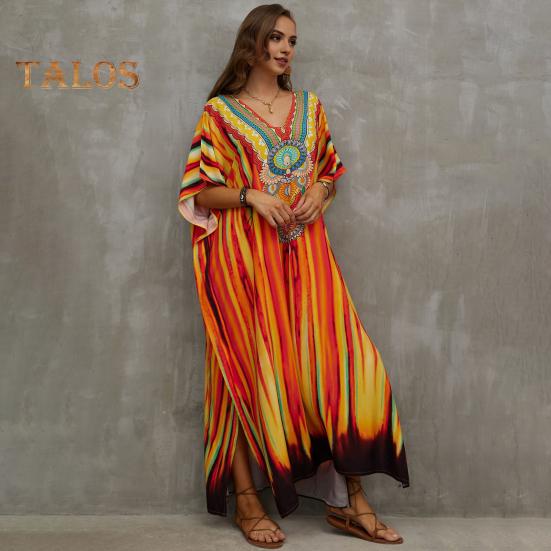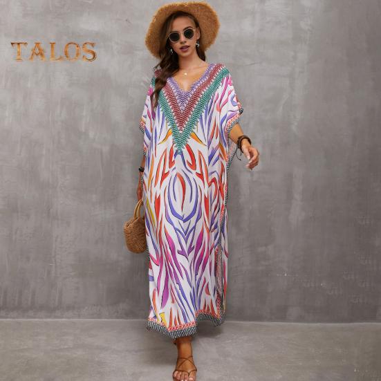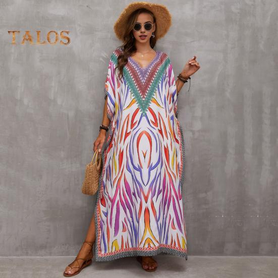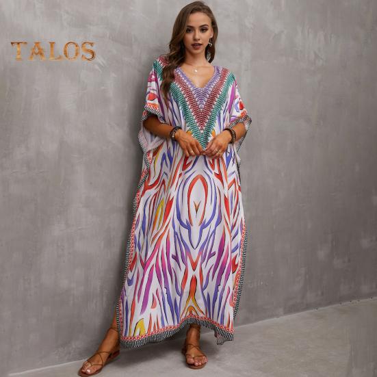 Стиль: Окунитесь в богемную атмосферу с этим потрясающим пляжным платьем-халатом свободного и повседневного силуэта, идеально подходящим для летних дней.. V-образный вырез и рукава с заниженной линией плеч придают нотку элегантности, а боковые разрезы обеспечивают легкость движений и ощущение свежести.