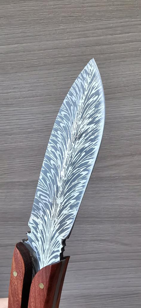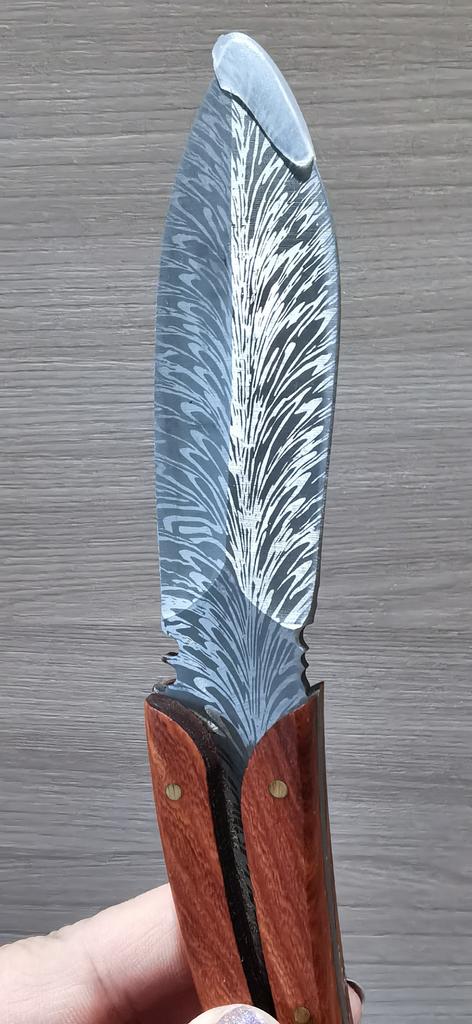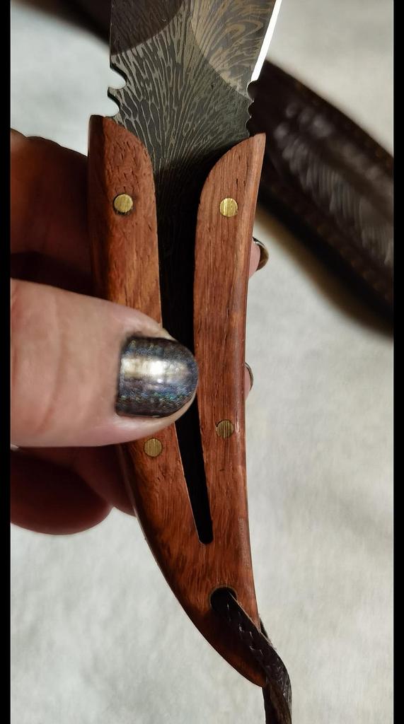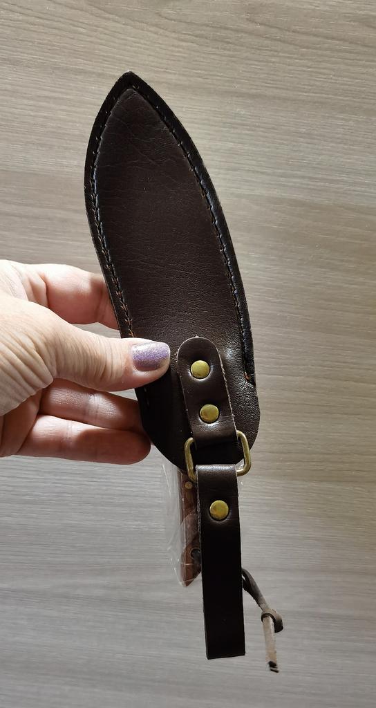 Острый нож из нержавеющей стали в необычном оформлении. 🔪 Пришел в картонной коробке, сам нож был упакован в пакет и кожаный чехол 🔪 Выполнен из нержавеющего металла 🔪 По весу достаточно тяжёлый 🔪 Ручка скорее всего пластиковая, но визуально похожа на дерево (выполнена на совесть 👍🏻) 🔪 Лезвие очень острое и режет отлично Легко справляется с куриными костями Замечательный ,качественный и острый нож, мне понравился, такой и не стыдно преподнести в качестве подарка .К покупке могу смело рекомендовать.