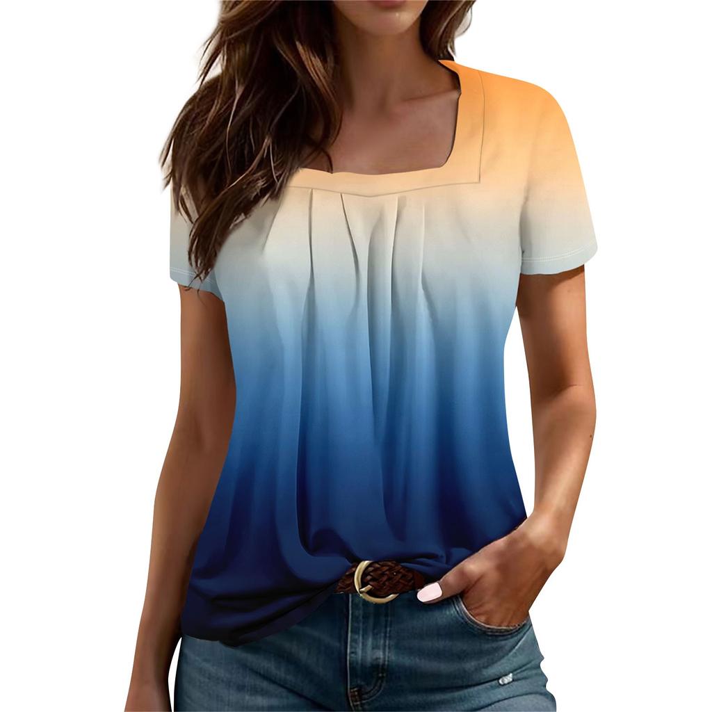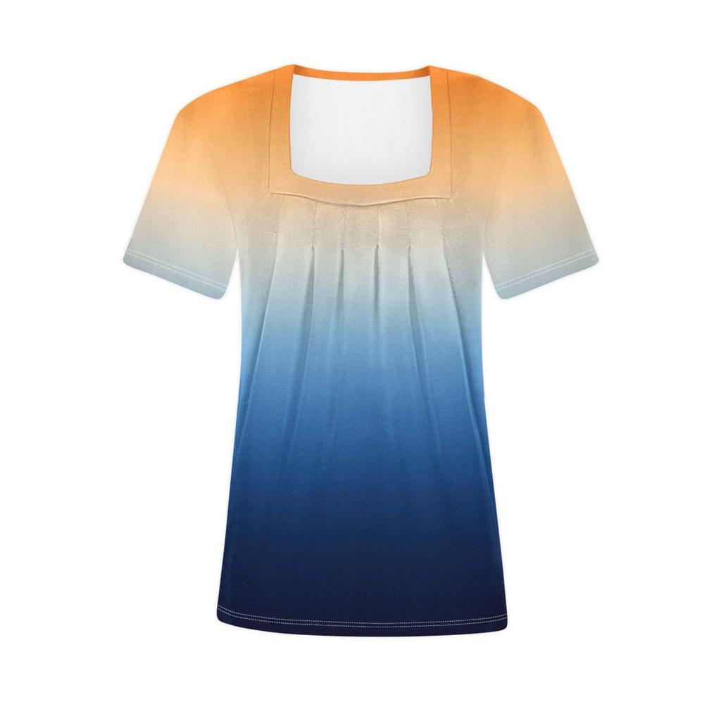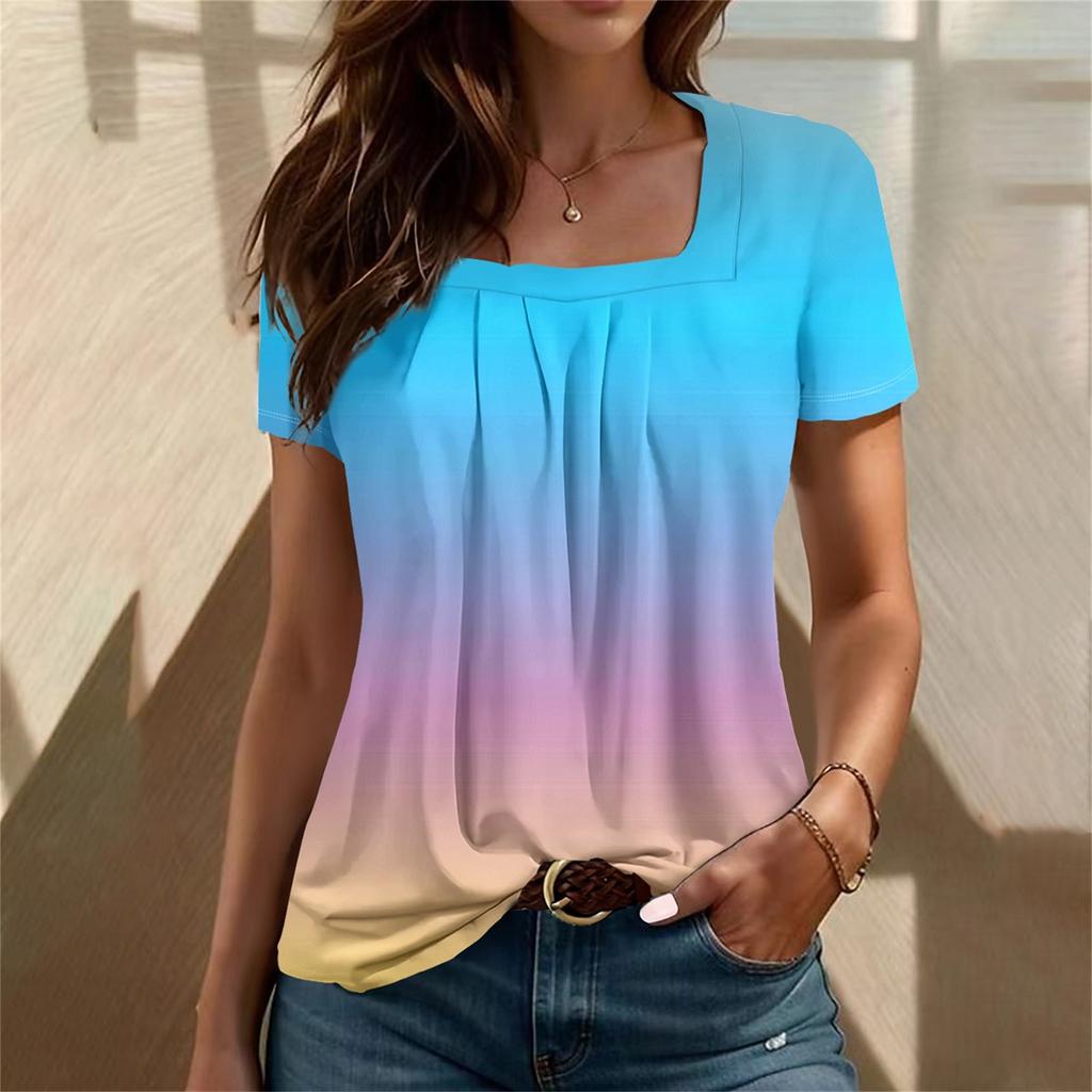 Женский повседневный плиссированный топ с короткими рукавами с квадратным вырезом и короткими рукавами с градиентным принтом