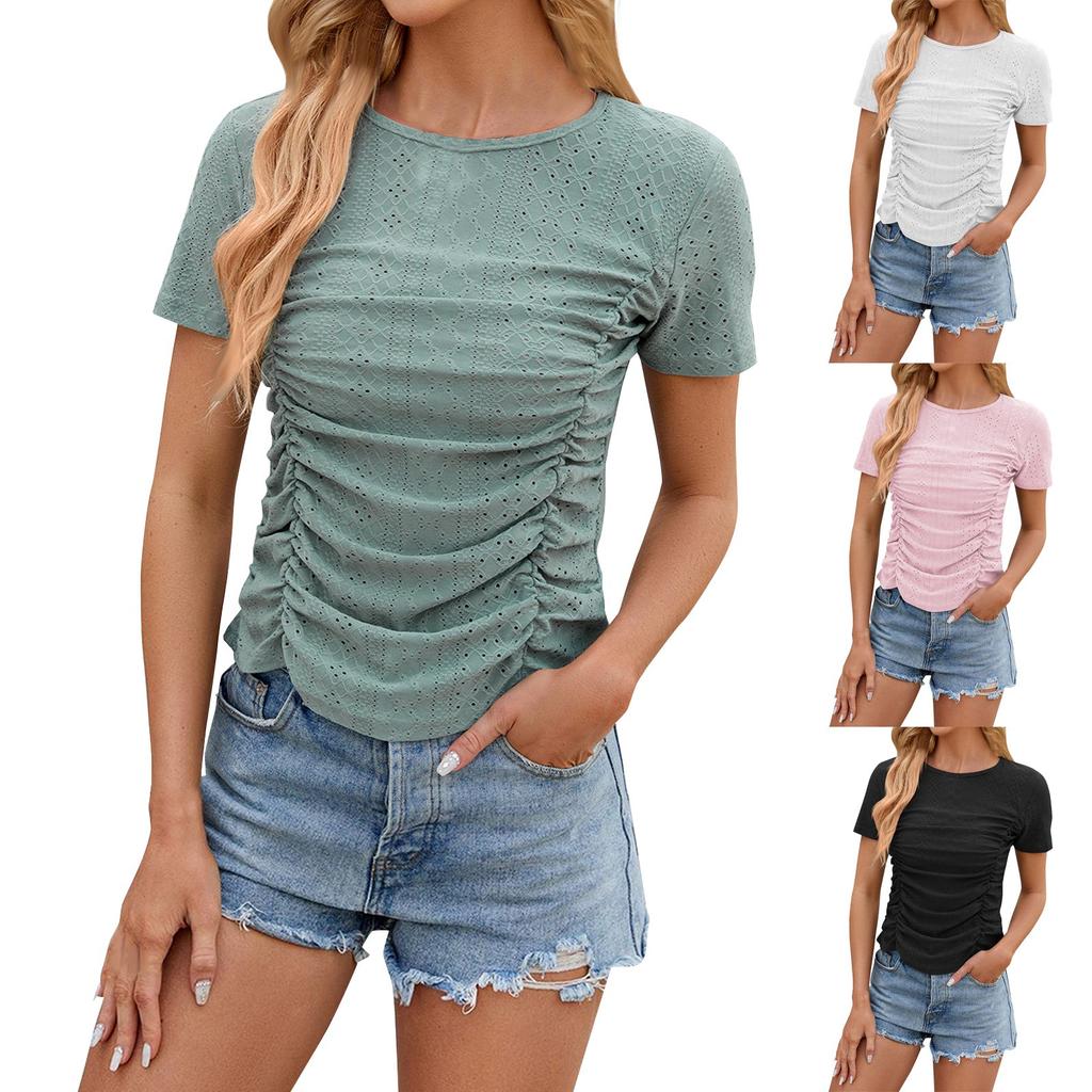 Женская однотонная повседневная плиссированная футболка с круглым вырезом