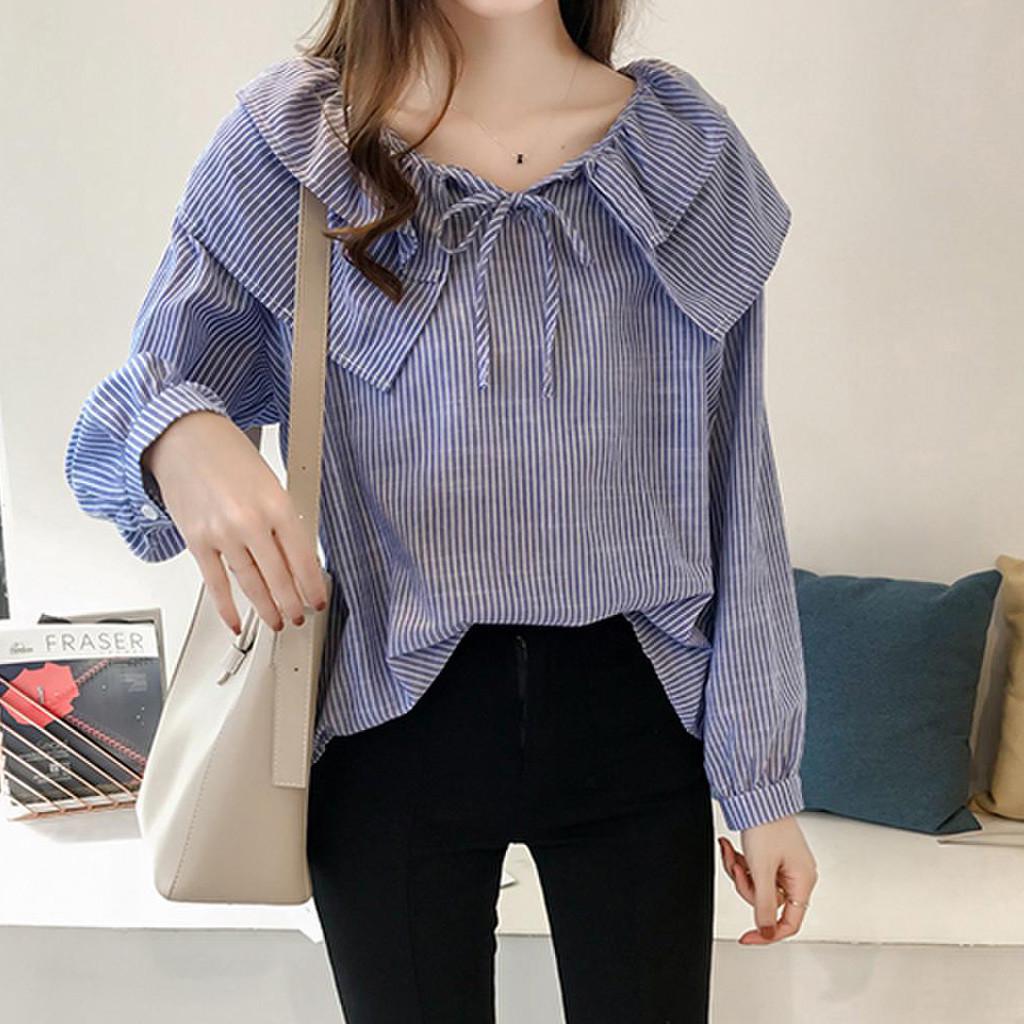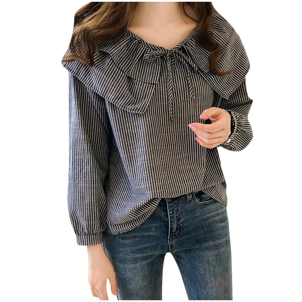 Модные женские повседневные полосатые женские свободные топы с длинными рукавами и оборками
