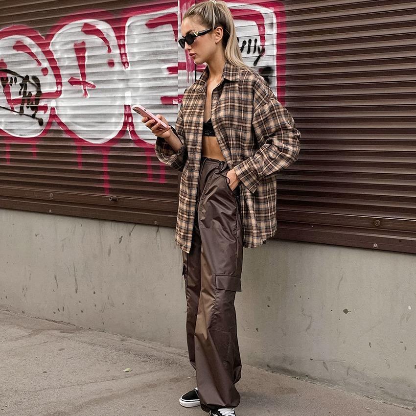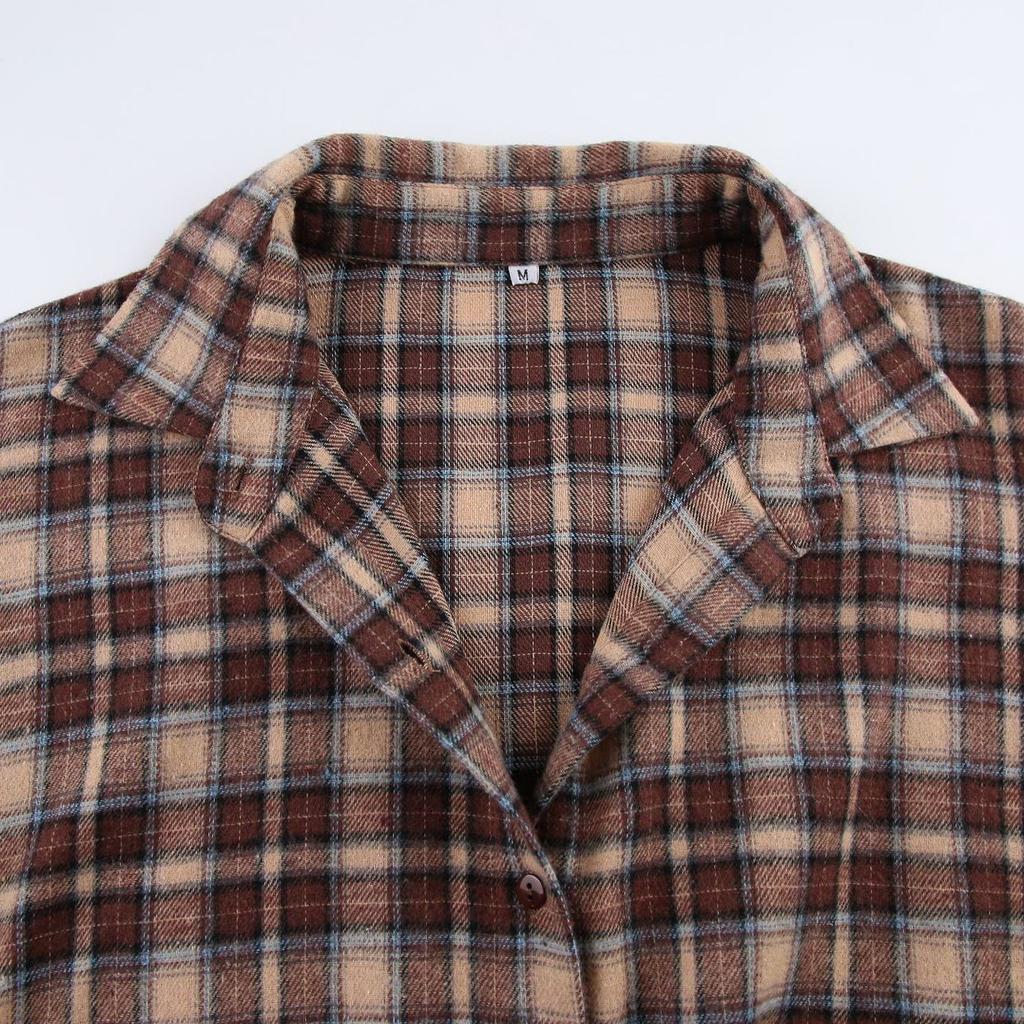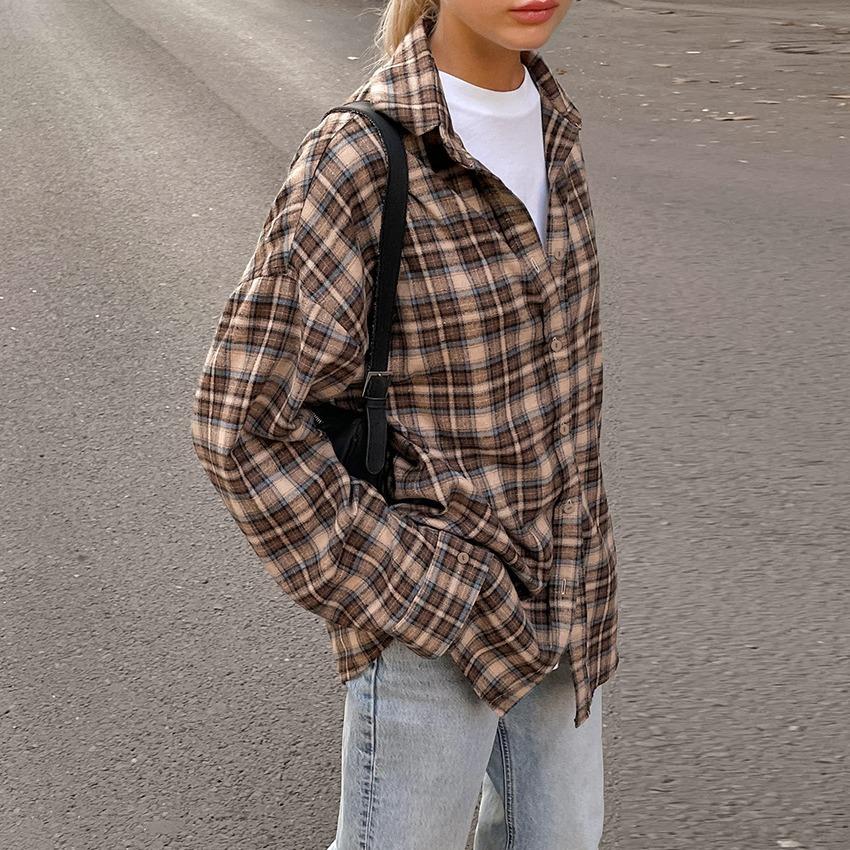 Коричневые клетчатые блузки, женские уличные свободные рубашки с длинными рукавами, повседневные офисные женские клетчатые топы с отложным воротником