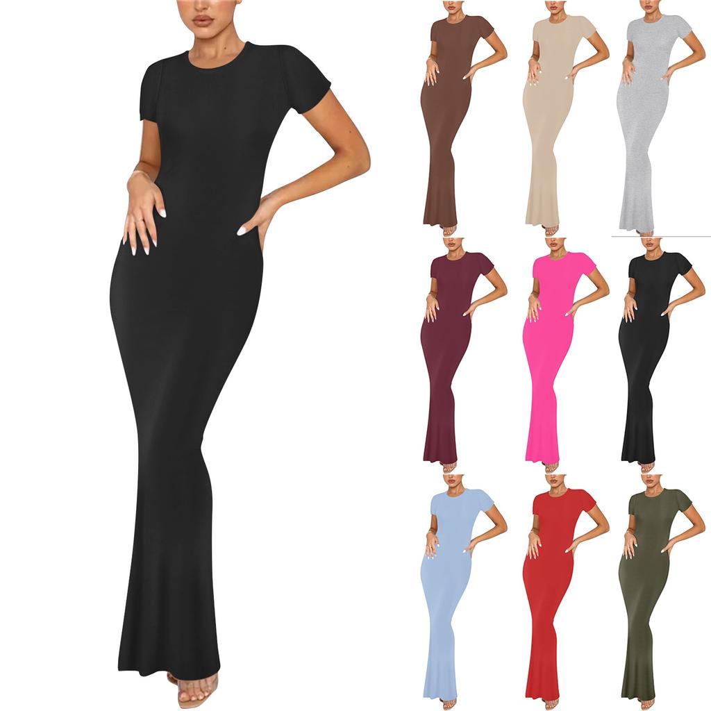 Женское модное и сексуальное однотонное длинное платье с круглым вырезом и короткими рукавами — купить товар онлайн с бесплатной доставкой до всему миру!
