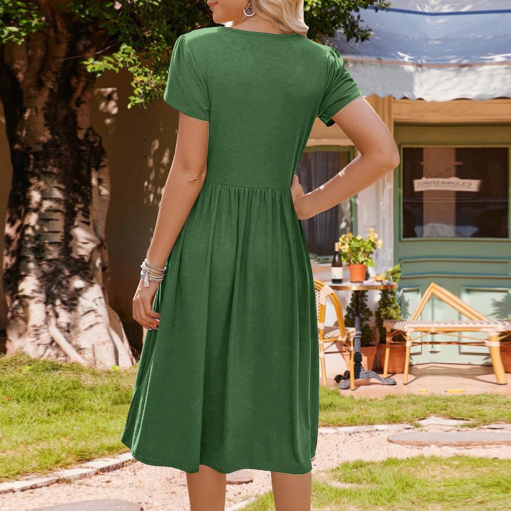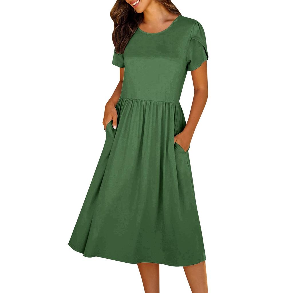 Женское повседневное однотонное платье с круглым вырезом и лепестками, с короткими рукавами, карманом и эластичной резинкой на талии