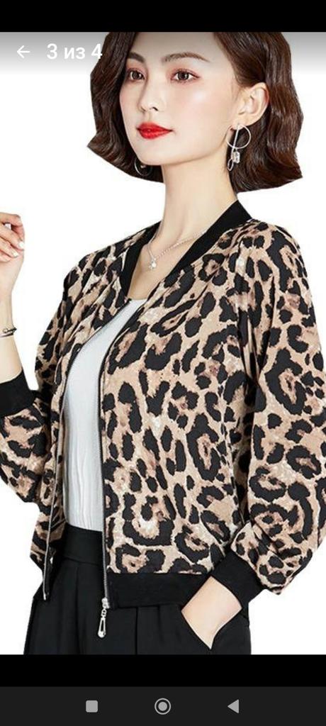 Женская куртка, расцветка леопард. У продавца представлена в двух цветах. Я взяла черный - размер L подошёл хорошо. На лето просто супер, лёгкая и тонкая. Было несколько ниточек - не критично. Товар понравился. Рекомендую.