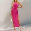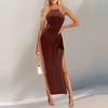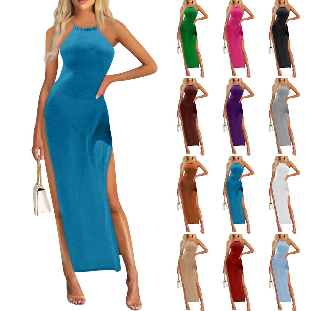 Женское платье с высоким разрезом и подтяжками, вязаное платье с воротником, летнее платье, сарафан без рукавов, платья-майки, пляжное платье