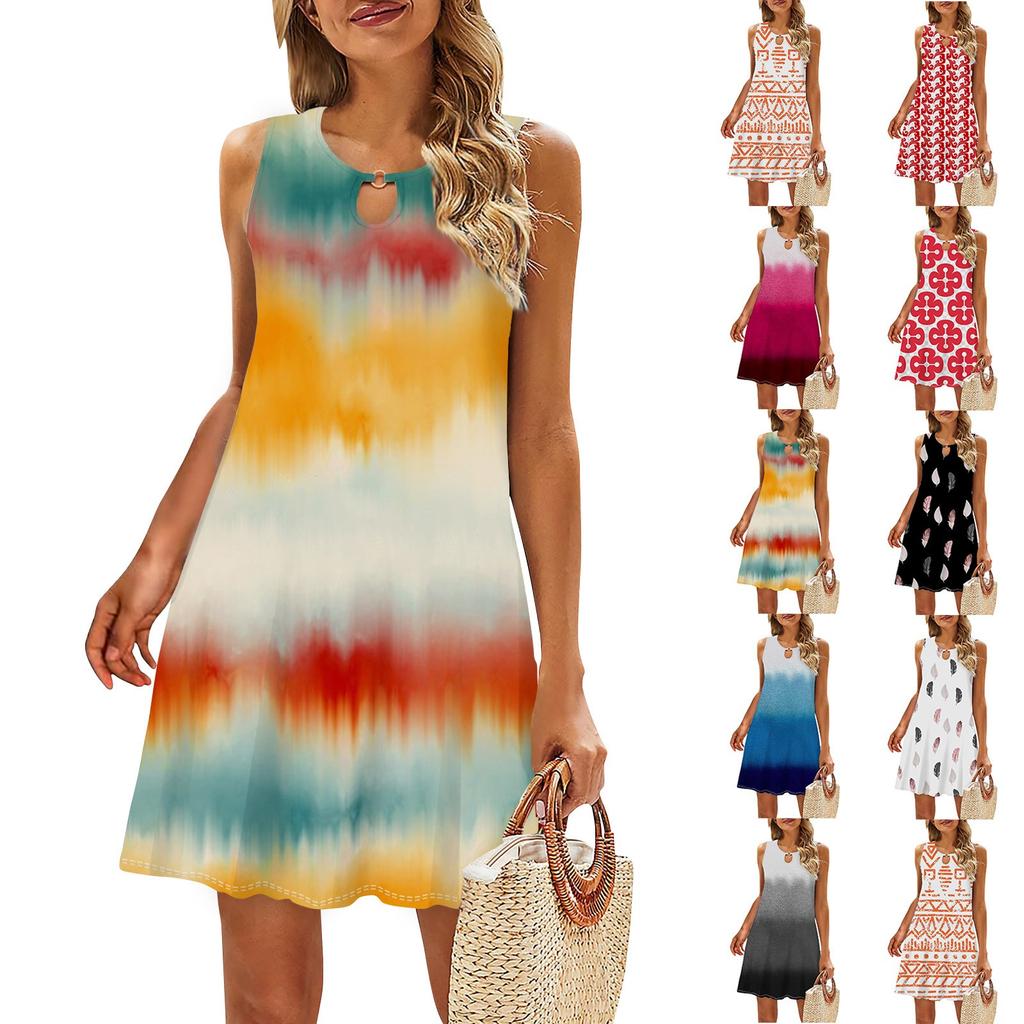 Женское повседневное летнее платье без рукавов с принтом, свободное пляжное платье с вырезами — купить товар онлайн с бесплатной доставкой до всему миру!