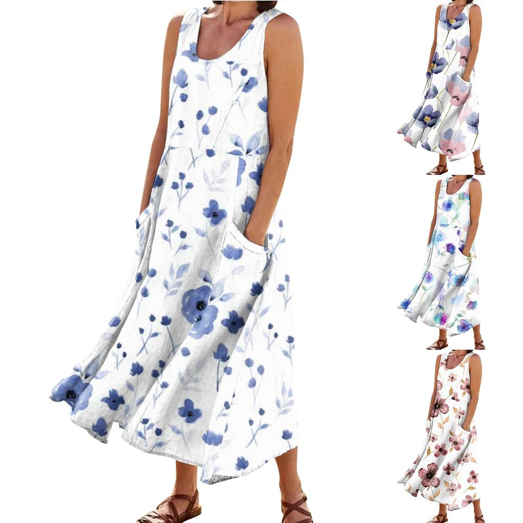 Женские модные повседневные платья из хлопка и льна без рукавов с цветочным принтом и небольшими карманами — купить товар онлайн с бесплатной доставкой до всему миру!