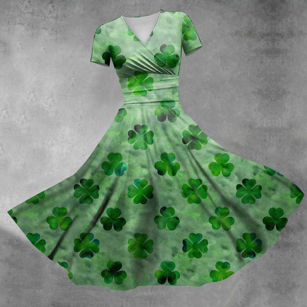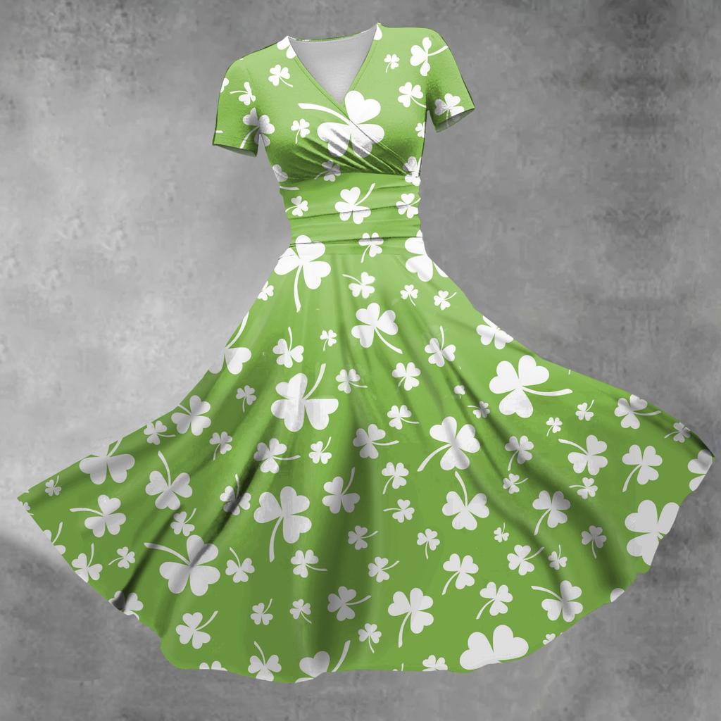Дамское платье принцессы с сексуальным v-образным вырезом St. Платье с короткими рукавами и принтом на талии в честь Дня Святого Патрика и оборками на талии