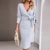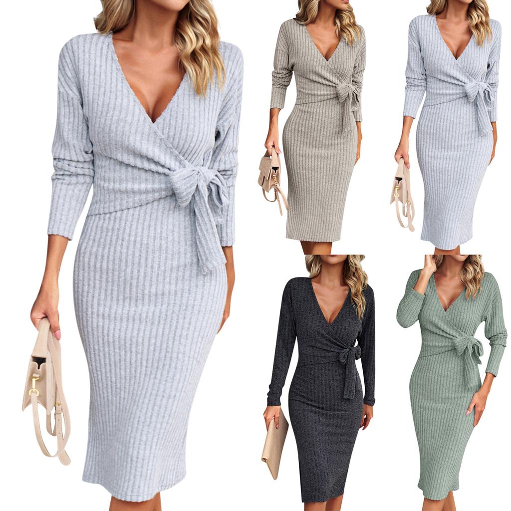 Женское осеннее и зимнее однотонное вязаное платье-свитер с v-образным вырезом, платья с тонкой талией и завязками — купить товар онлайн с бесплатной доставкой по всему миру!