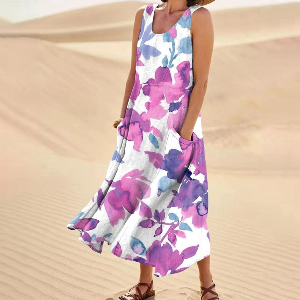 Женское повседневное удобное хлопковое карманное платье без рукавов с цветочным принтом