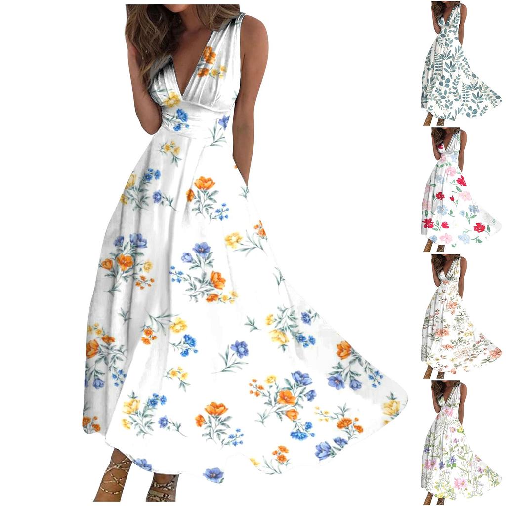 Женское длинное платье Платье макси Повседневное платье Летнее повседневное платье без рукавов с v-образным вырезом в стиле бохо с талией и принтом