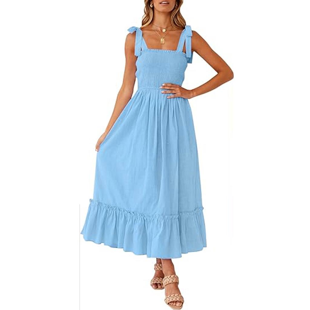 Женские модные богемные бретели с квадратным вырезом, однотонные пляжные длинные платья трапециевидной формы с рюшами