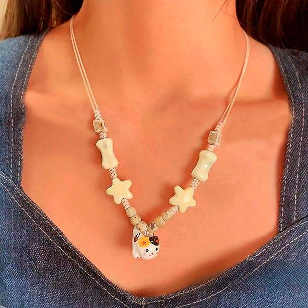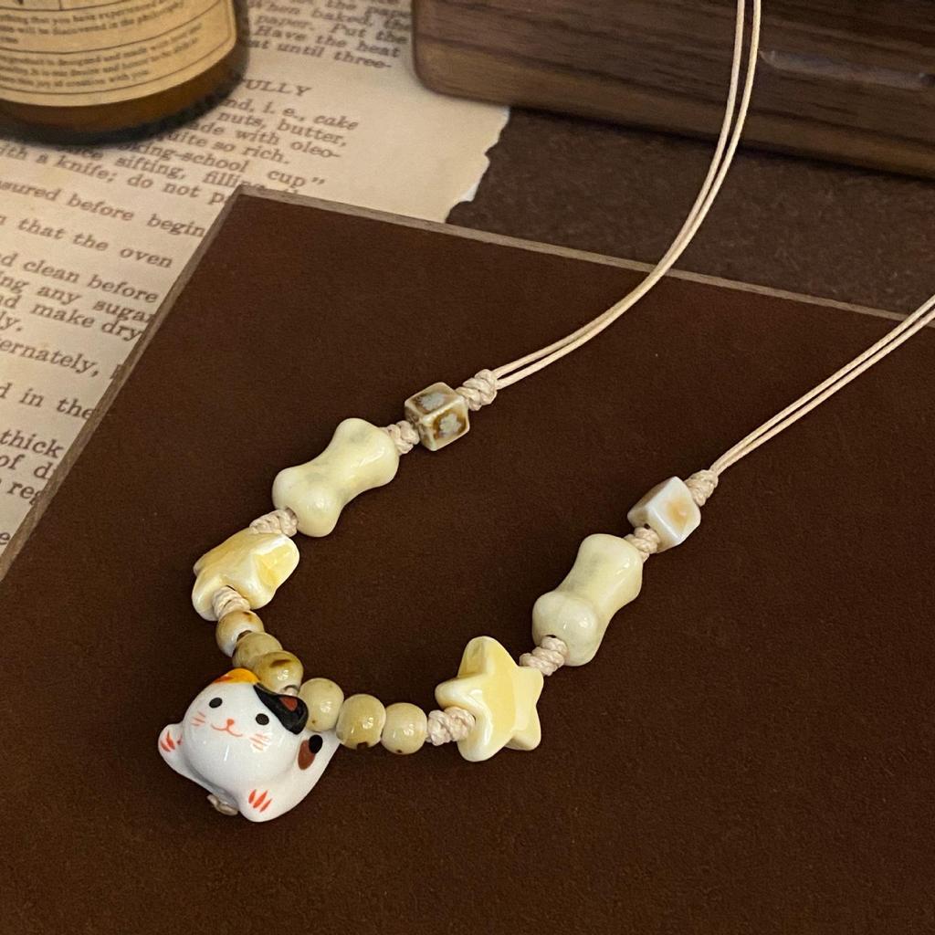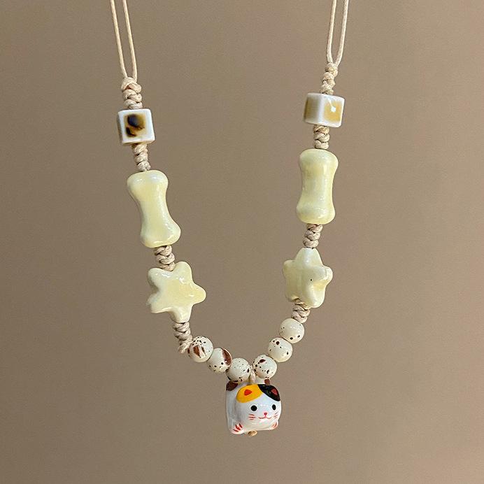Милое керамическое ожерелье с плетеной веревкой в виде кошки и звезды, дизайн меньшинства, милое ретро, милое крутое ожерелье для девочек, модные украшения