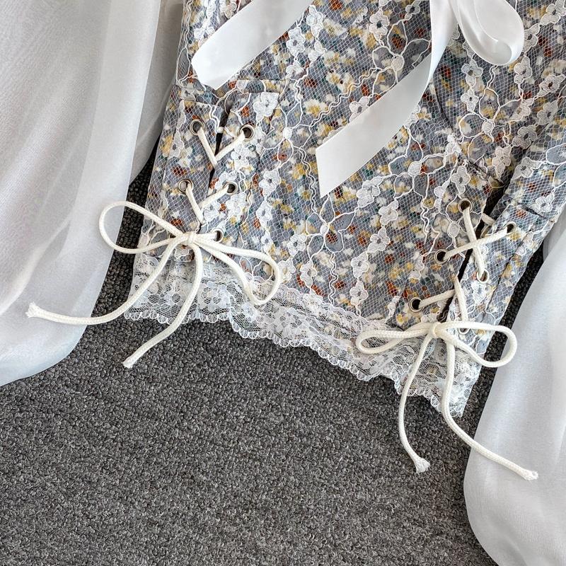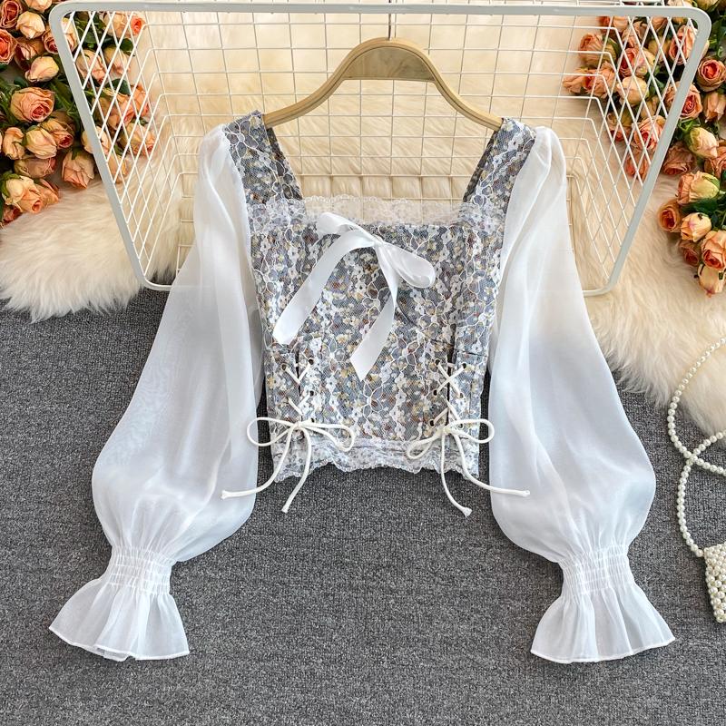 Летние модные сетчатые блузки с цветочным принтом, женские лоскутные рубашки, винтажные повязки, тонкие женские элегантные готические кружевные топы, офисные топы
