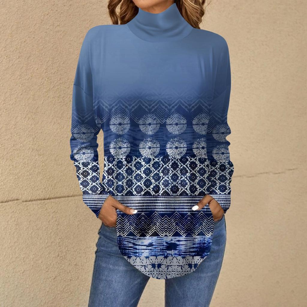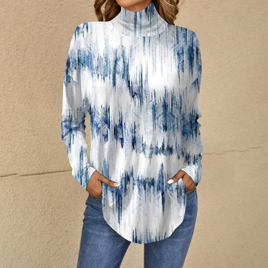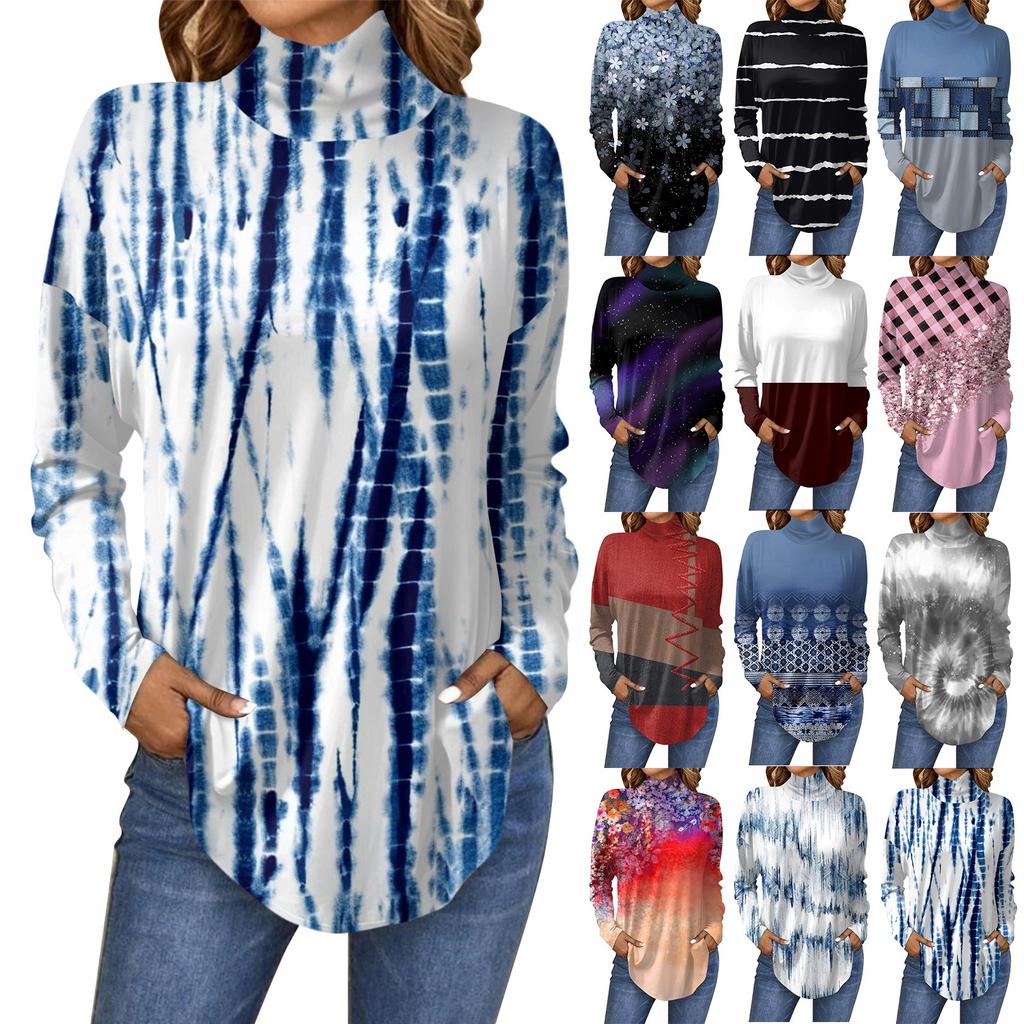 Женская мода Свободная футболка с длинным рукавом с высоким воротом и принтом Повседневные топы Пуловер