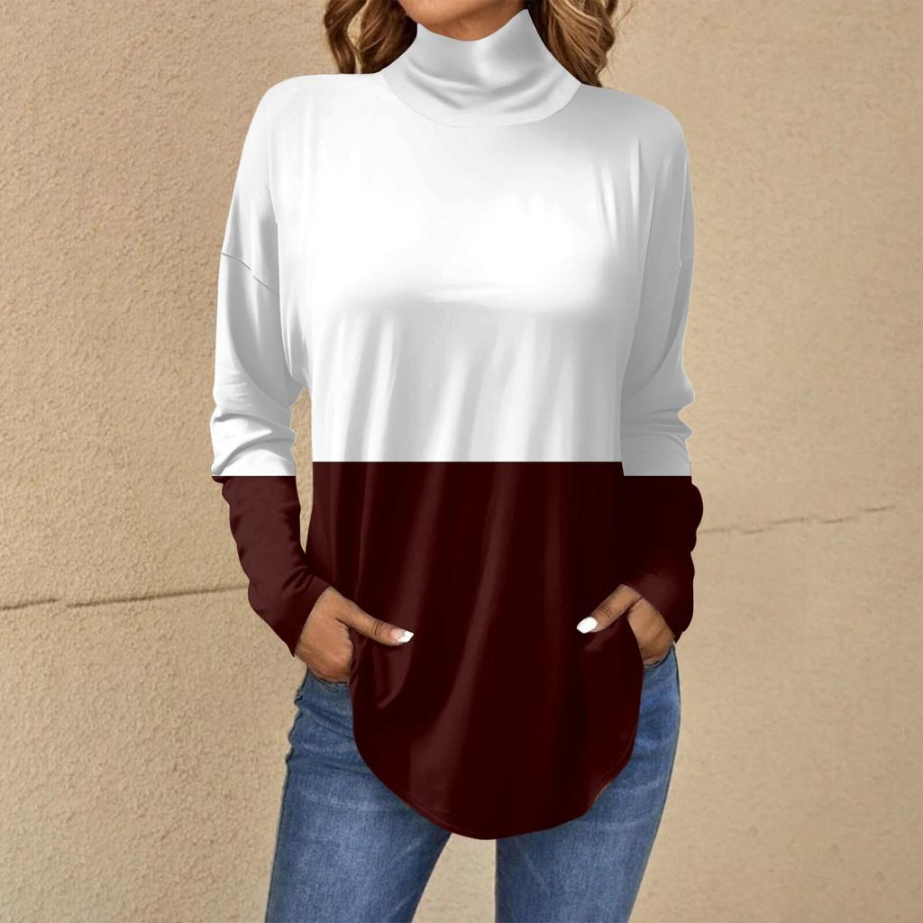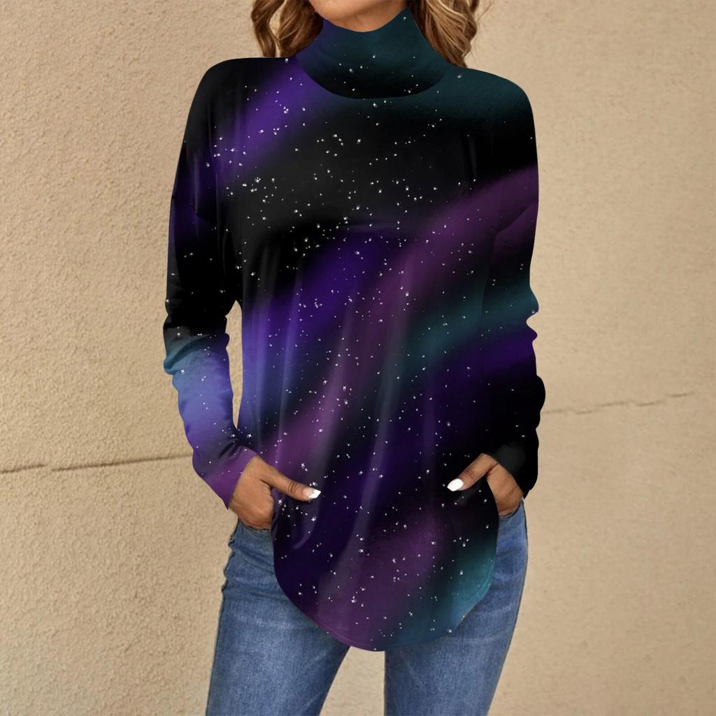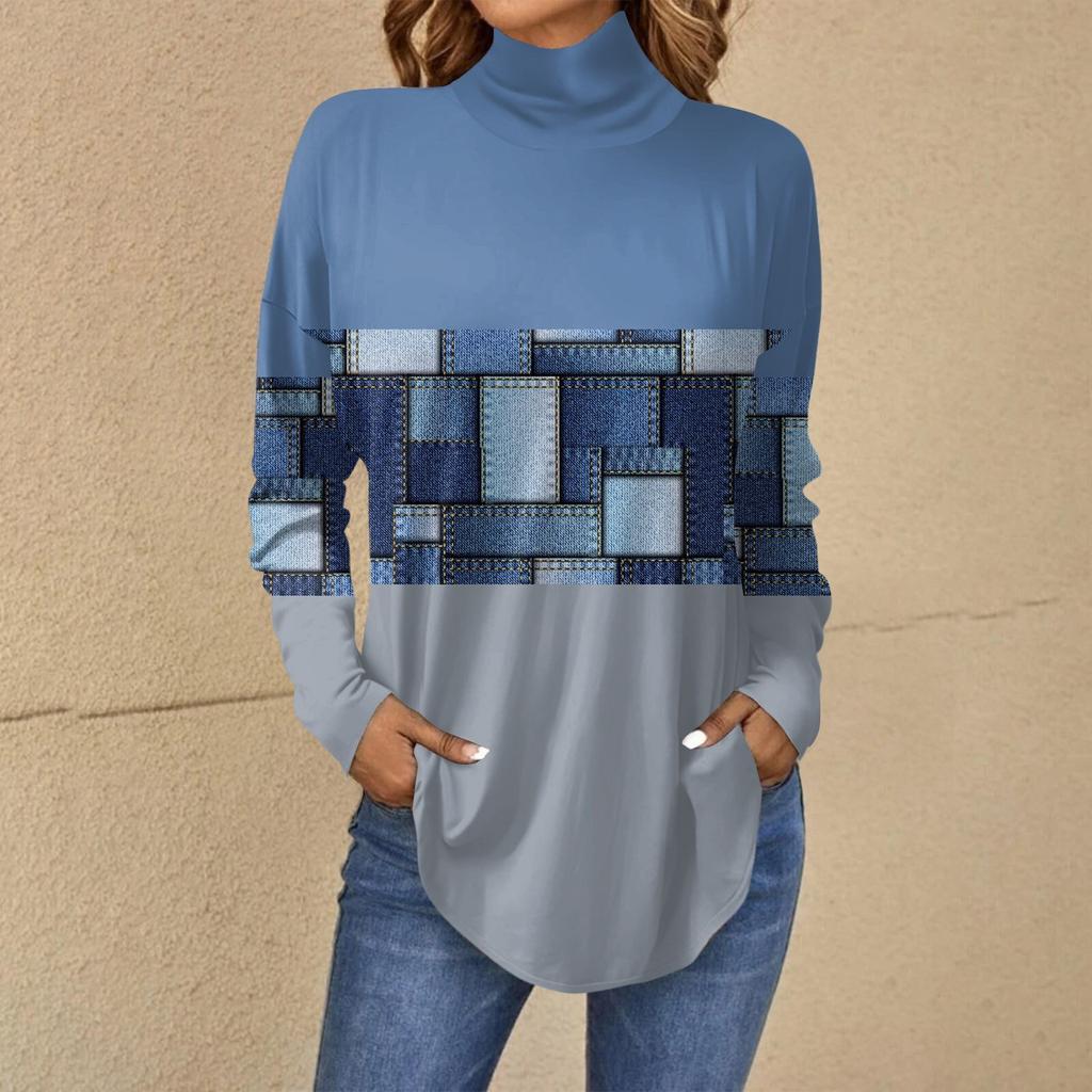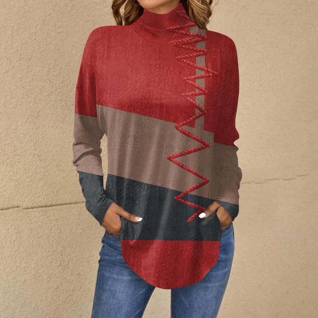 Женская мода Свободная футболка с длинным рукавом с высоким воротом и принтом Повседневные топы Пуловер