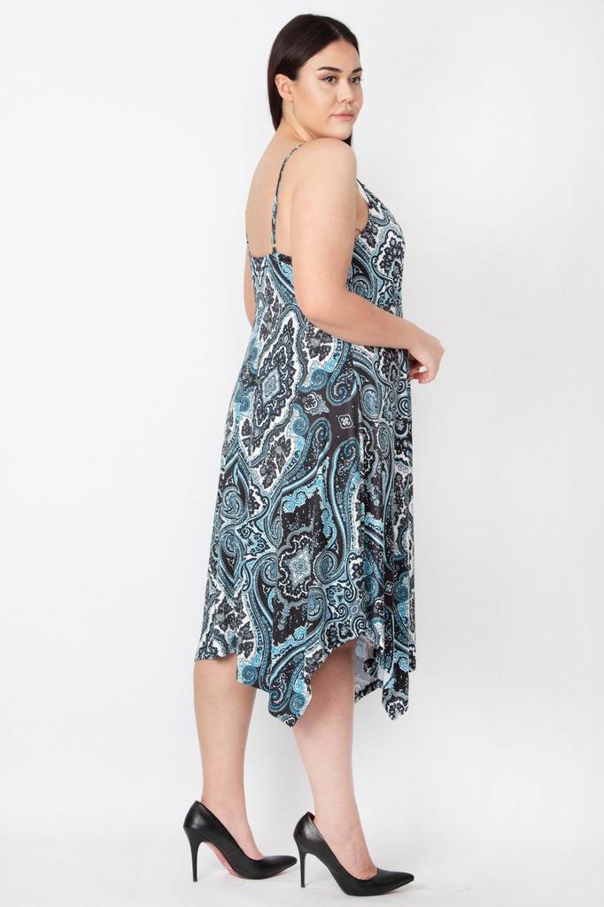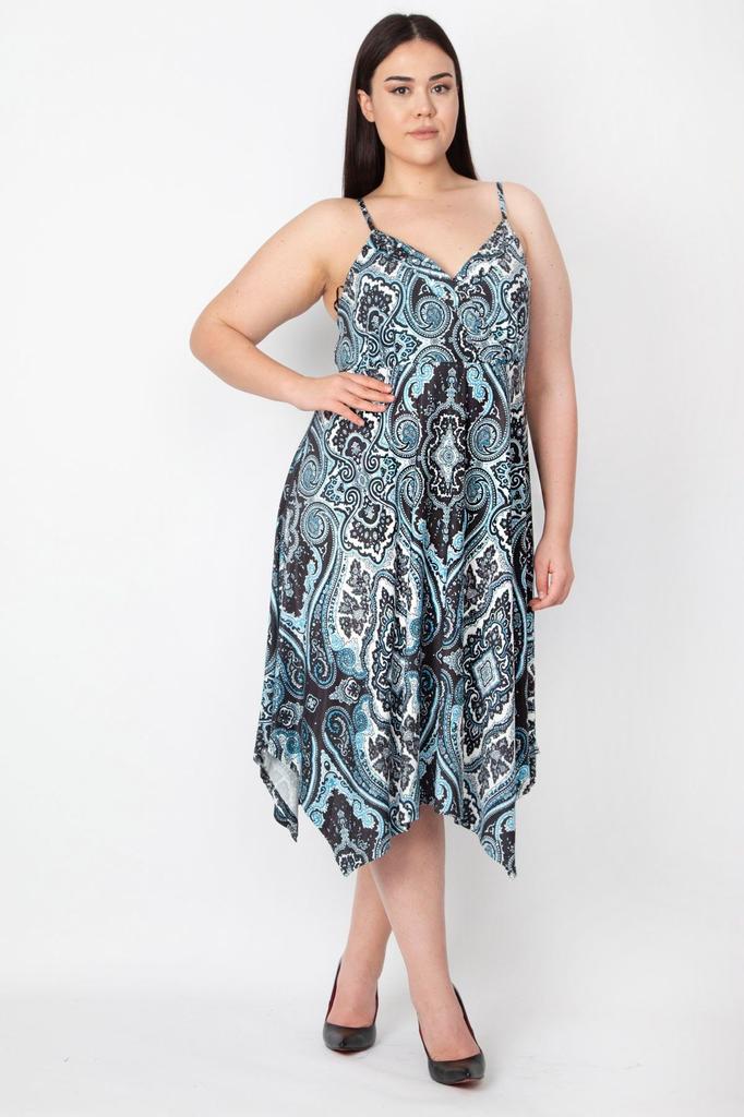 Женское платье больших размеров бирюзового цвета с бретельками и асимметричным кроем