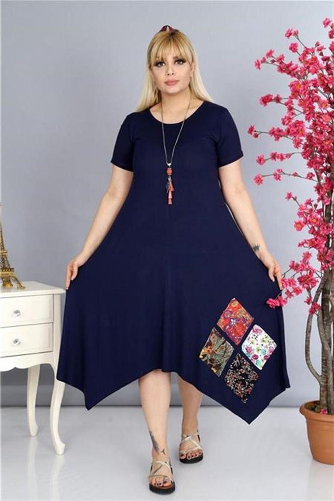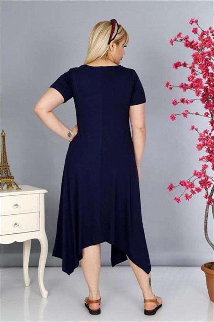 Темно-синее платье больших размеров асимметричного кроя Образец длины изделия: 130 см (Может варьироваться в пределах 1-2 см).