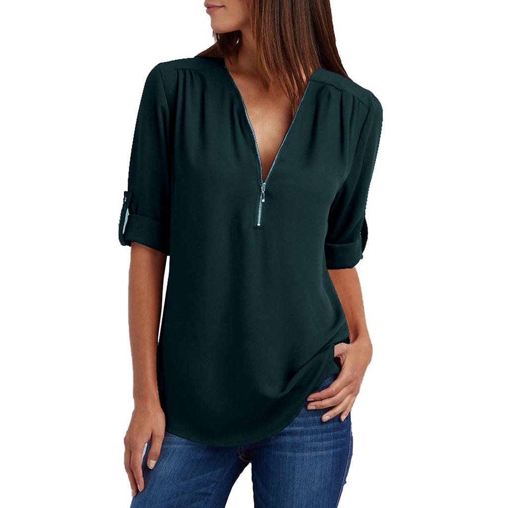 Женская модная повседневная однотонная блузка с застежкой-молнией и v-образным вырезом со складными рукавами, свободная футболка