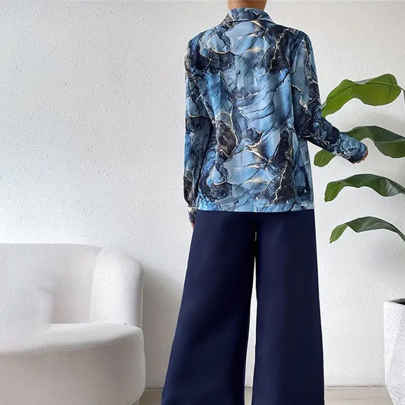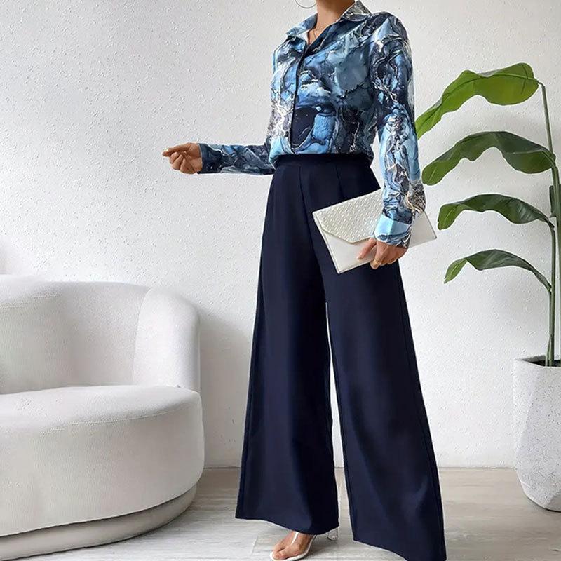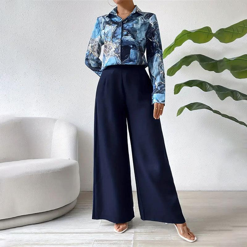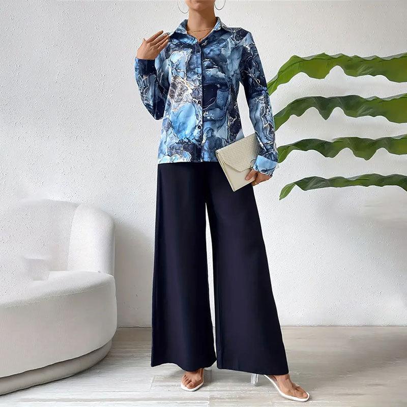 Летняя женская рубашка с длинным рукавом с принтом, однотонный повседневный комплект из широких брюк-клеш
