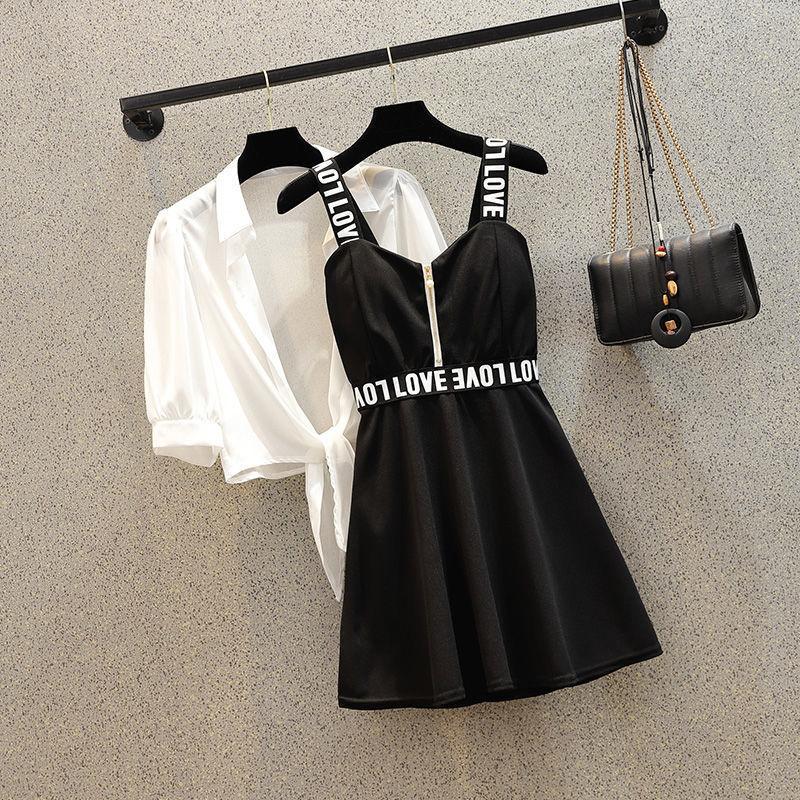 Женский летний костюм большого размера, черное платье-майка, женские модные солнцезащитные рубашки, комбинезон на молнии с буквенным принтом, комплект из двух предметов