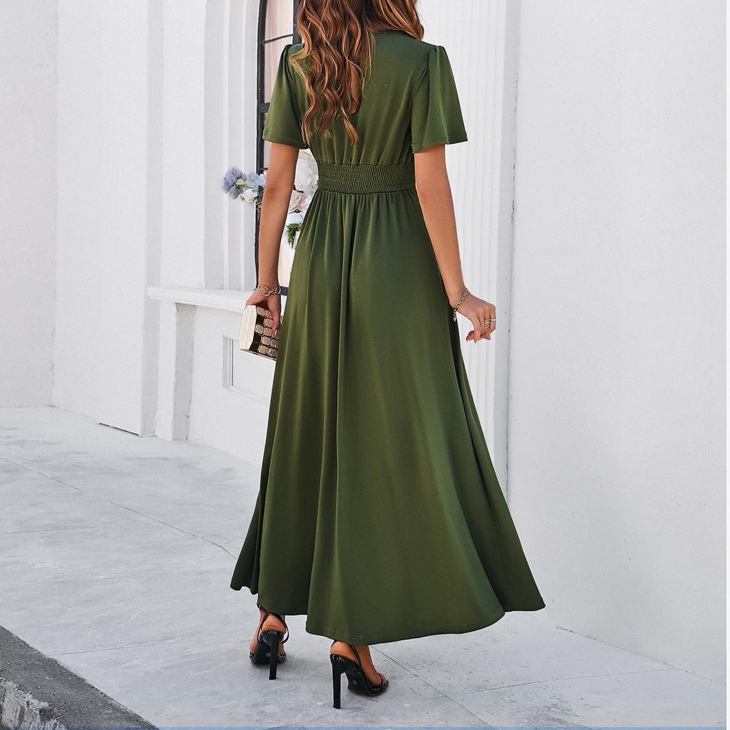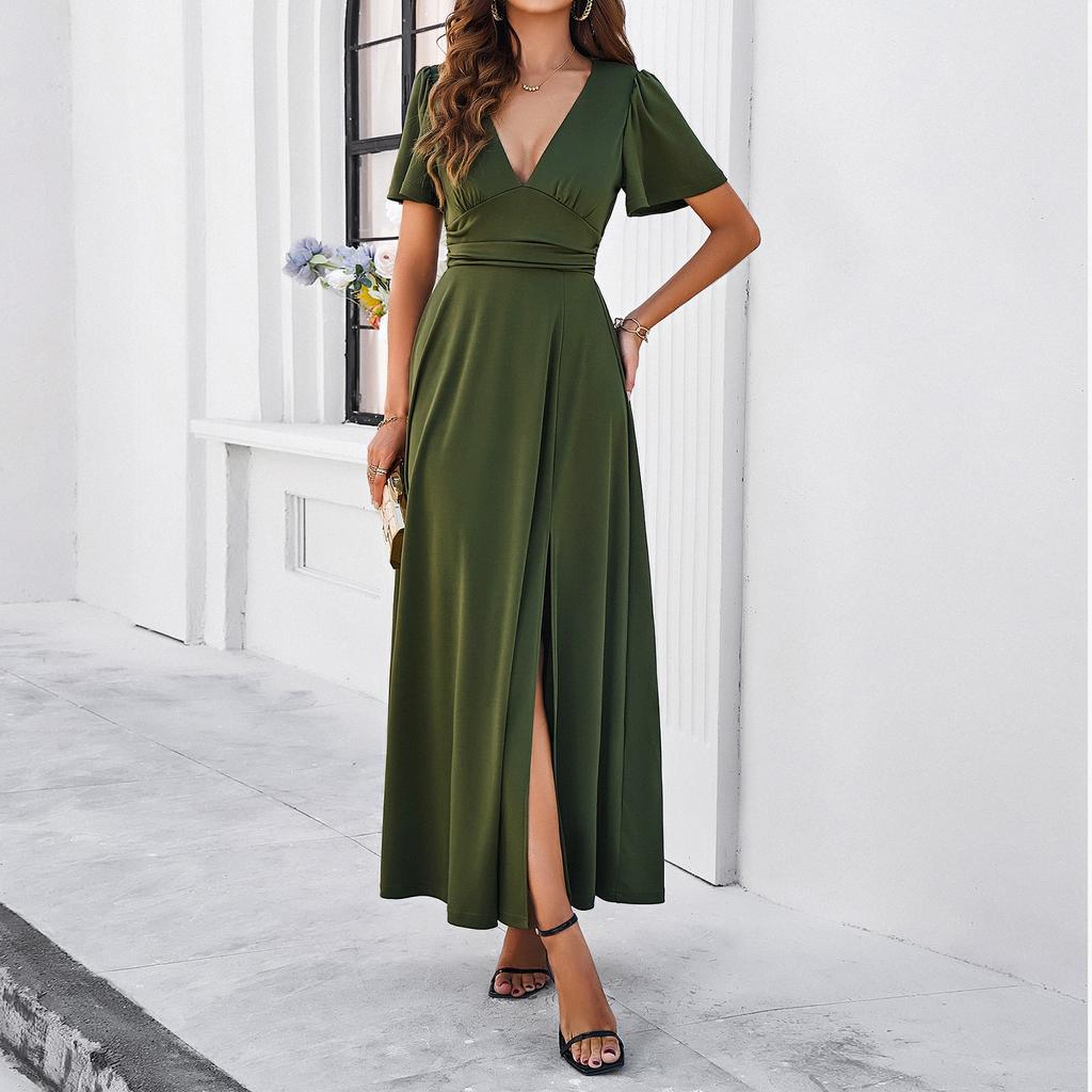 Женские повседневные длинные вечерние платья Вечерние платья Сплошной цвет с разрезом Элегантные свадебные платья трапециевидной формы с v-образным вырезом и короткими рукавами Гостевые платья