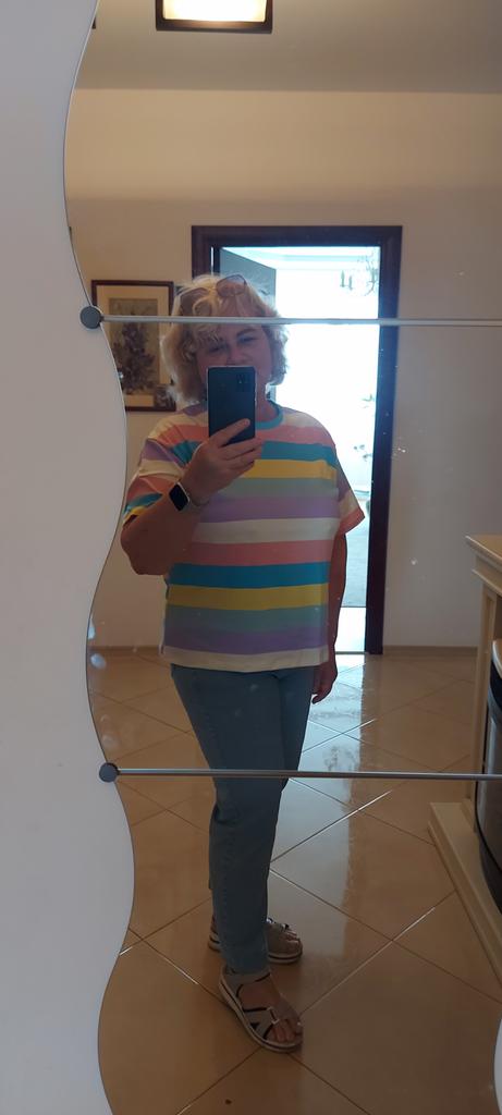 Футболка несколько разочаровала. Не люблю, когда полоски расположены под наклоном. На боковых швах полосы не совпадают от слова совсем. На образце всё идеально. Считаю, что для синтетики цена не соответствует. Спасает только цветовая гамма, которая как на картинке.