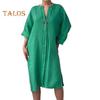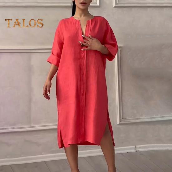 Женское осенне-летнее платье Свободное платье с V-образным вырезом и рукавами три четверти Трапециевидной формы Сплошной цвет с разрезом на пуговицах Декор Повседневная повседневная одежда Платье миди