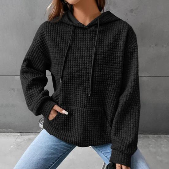 Сохраняйте уют и шик в этой весенне-осенней однотонной женской толстовке с длинными рукавами и вафельным узором.. Большой карман с капюшоном придает нотку непринужденного стиля, а вафельная текстура подчеркивает общую привлекательность этого предмета гардероба.