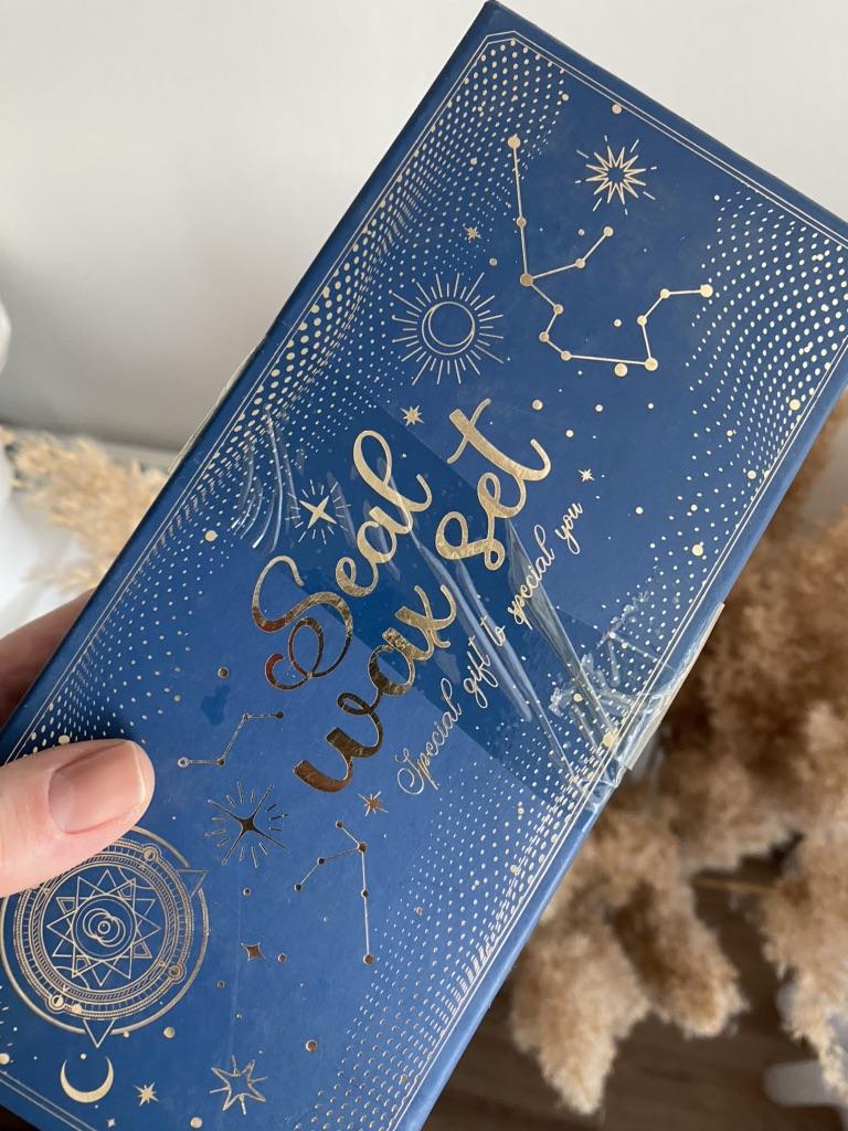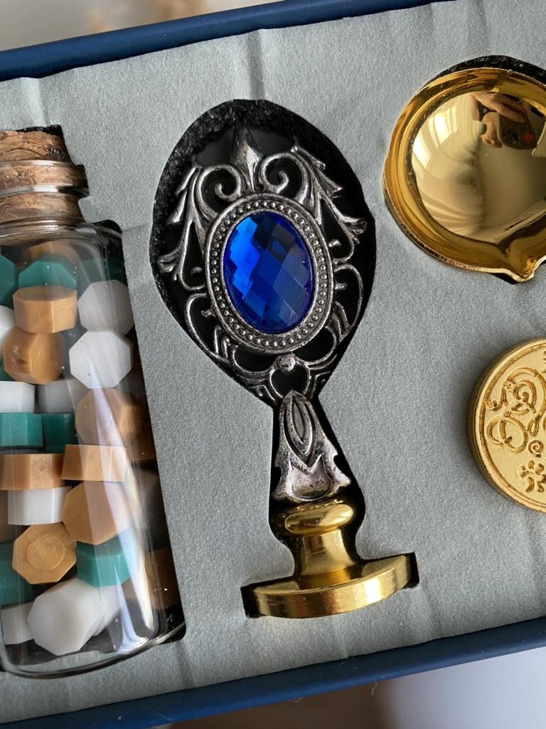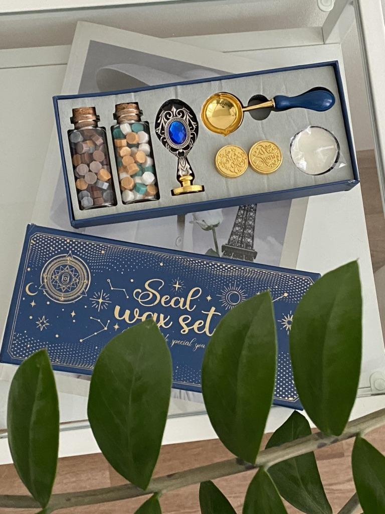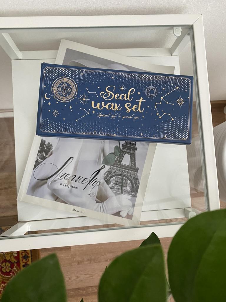 Крутейший восковой набор, который брала дочке в подарок. В комплекте основа для крепления печати и три варианта, ложечка и свечка для плавления воска, воск - две бутылочки разных цветов. Дочка экспериментировала и использовала смесь цветов. Набор очень понравился, только вот крышка была закончена какой-то белой этикеткой, поэтому если вам на подарок, придется упаковать в подарочную бумагу. Доставка около трёх недель до Санкт-Петербурга.
