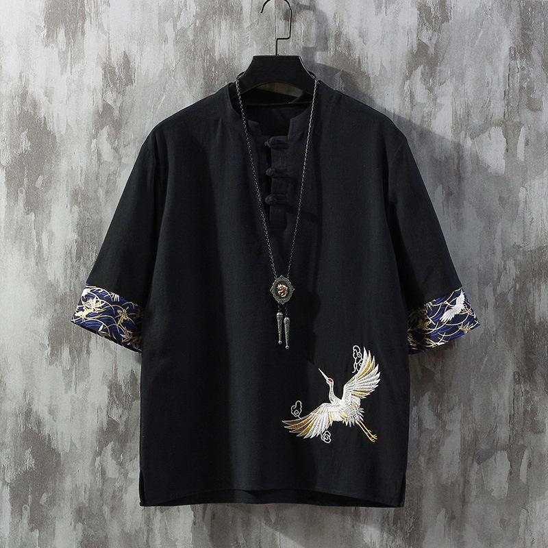 Мужские футболки с вышивкой журавля, одежда в традиционном японском стиле, мужские льняные рубашки с коротким рукавом, однотонные рубашки с воротником мадарин