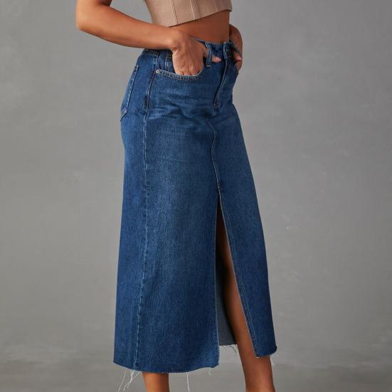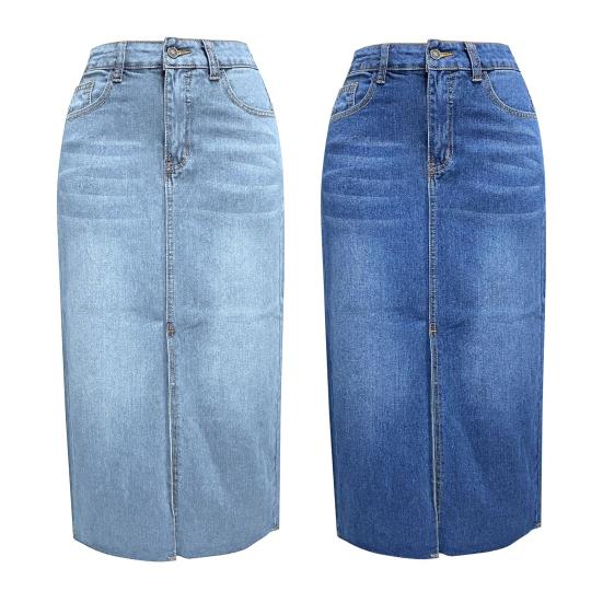 Характеристики: Эта джинсовая юбка застегивается на пуговицы на молнии на талии, карманы по бокам и сзади, а также юбка А-силуэта с разрезом по центру.