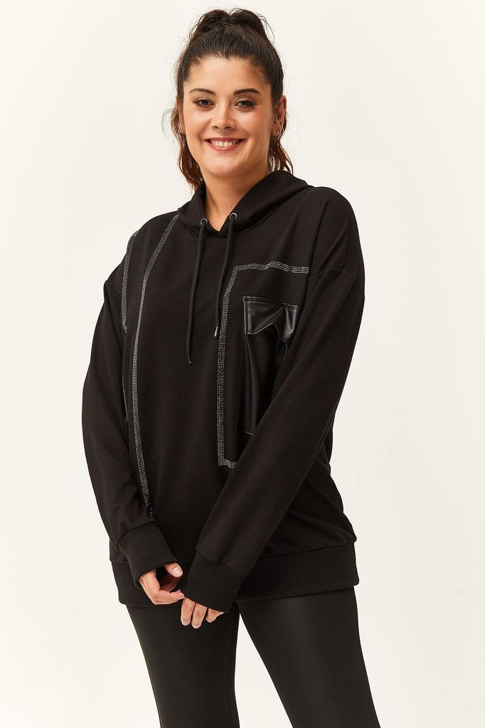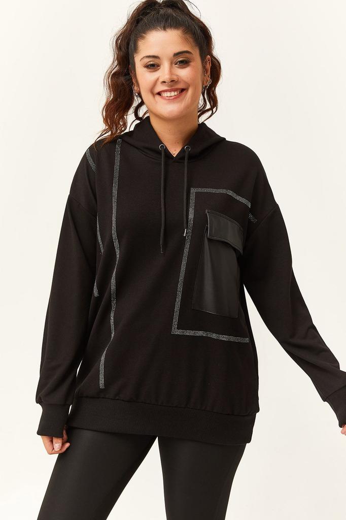 Women's Style Big Size Sweatshirt Large Size Leather Pocket Detailed Stone Embroidered Black Sweatshirt|Women's Large Size Leather Pocket Detailed Stone Embroidered Sweatshirt. | Hooded. | Leather Pocket Detailed. | Stone Embroidered. | Waist and Arm End Elastic. | You Should Hand Wash For Long-Term Use.. | You should definitely not dry it in the dryer.. | Fabric Content: 95% Viscose, 5% Lycra. | Produced as L-Xl-2Xl and 3Xl.. | The product is Knitted Fabric. Measurements May Vary Due to Fabric Flexibility.. | L Size Measurements: Chest 112 Cm, Product Length 75 Cm. | Xl Body Measurements: Chest 114 Cm, Product Length 75 Cm. | 2Xl Body Measurements: Chest 118 Cm, Product Length 76 Cm. | 3Xl Body Measurements: Chest 120 Cm, Product Length 76 Cm. | | Material:Viscose Blended | Pattern:Plus Size | Style:Trend | Sleeve Type:Long Sleeve | Fabric Type:Knitted | Colour:Black | Pattern:Natural Stone Look | Collar Type: Hooded | Environment:Casual | Height:Regular | Sleeve Length: Long | Weaving Type:Viscose | Pocket:Patch Pocket ||Size: S, Chest: 84-88cm, Waist: 66-70cm, Hips: 92-96cm | Size: M, Chest: 90-94cm, Waist: 72-76cm, Hips: 98-102cm | Size: L, Chest: 96-100cm, Waist: 78-82cm, Hips: 104-108cm | Size: XL, Chest: 102-106cm, Waist: 84-88cm, Hips: 110-114cm | Size: 2XL, Chest: 108-112cm, Waist: 90-94cm, Hips: 116-120cm | Size: 3XL, Chest: 112-116cm, Waist: 94-98cm, Hips: 122-126cm | Size: 4XL, Chest: 118-122cm, Waist: 100-104cm, Hips: 128-132cm | Size: 5XL, Chest: 124-128cm, Waist: 106-110cm, Hips: 134-138cm | Size: 6XL, Chest: 130-134cm, Waist: 112-116cm, Hips: 140-144cm | Size: 7XL, Chest: 136-140cm, Waist: 118-122cm, Hips: 146-150cm | Size: 8XL, Chest: 142-146cm, Waist: 124-128cm, Hips: 152-156cm | Size: 9XL, Chest: 148-152cm, Waist: 130-134cm, Hips: 158-162cm | Size: 10XL, Chest: 154-158cm, Waist: 136-140cm, Hips: 164-168cm | Size: 11XL, Chest: 160-164cm, Waist: 142-146cm, Hips: 170-174cm | Size: 12XL, Chest: 166-170cm, Waist: 148-152cm, Hips: 176-180cm | Size: 13XL, Chest: 172-176cm, Waist: 154-158cm, Hips: 182-186cm | Size: 14XL, Chest: 178-182cm, Waist: 160-164cm, Hips: 188-192cm | Size: 15XL, Chest: 184-188cm, Waist: 166-170cm, Hips: 194-198cm