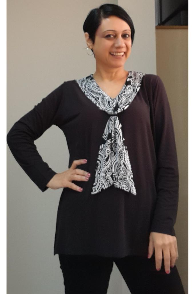 Женская стильная футболка большого размера, черная футболка из вискозы из чесаного хлопка с воротником-шарфом и черно-белыми цветовыми блоками