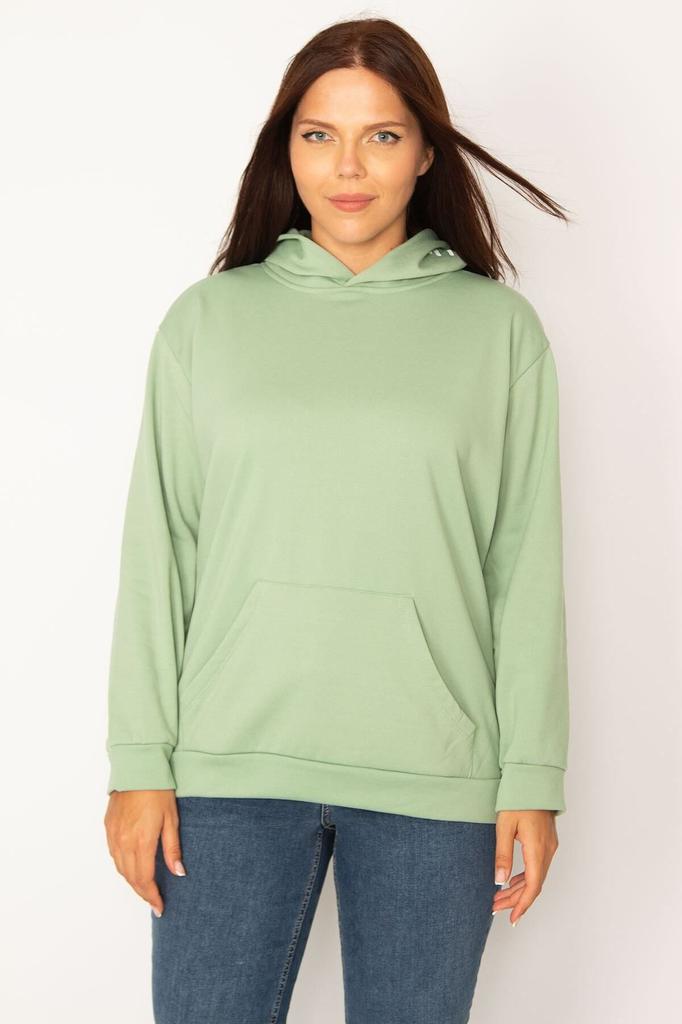 Women's Style Big Size Sweatshirt Large Size Green Hooded Sweatshirt With Kangaroo Pocket And Ribbon Inside
