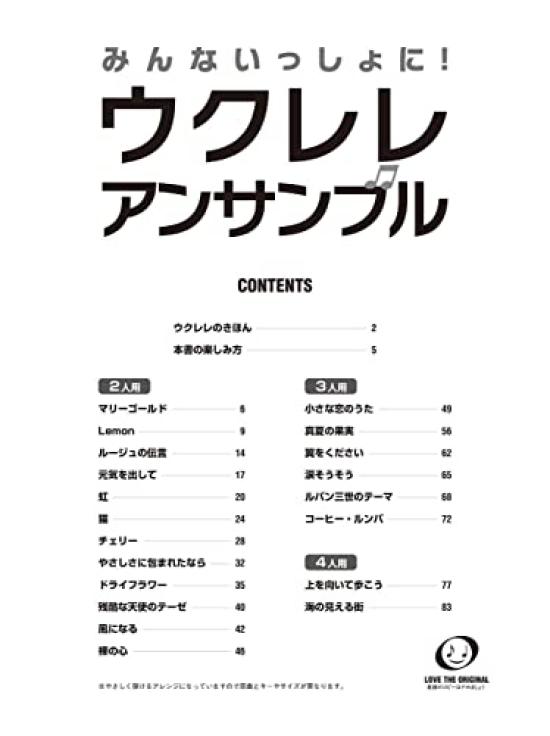 Коллекция ансамблевых партитур, которую могут слушать от 2 до 4 человек! Включает партитуры для ансамблей из 2 человек с мелодией и аккордовым сопровождением, а также более эффектные ансамбли из 3 и 4 человек с добавлением гармоний.. Партитуры публикуются в пятистрочной нотации, табулатуре, нотации аккордов и схемах, чтобы вы могли наслаждаться игрой, осознавая каждую партию.. В сборник вошло 20 тщательно отобранных песен, в основном это известные популярные песни J-POP.