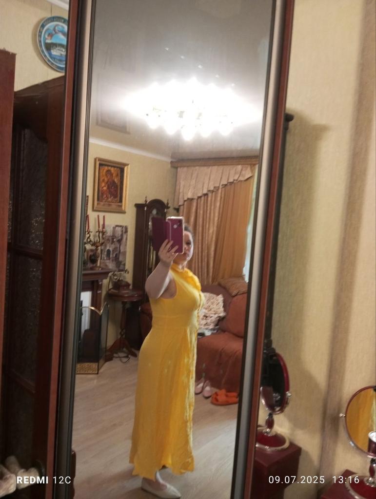 Доброго времени суток! Сарафан очень хорошо сидит на фигуре, замечательный канареечный цвет! Материал похож на жатый хлопок, натуральный, в жару тело дышит, и в нём находиться комфортно.