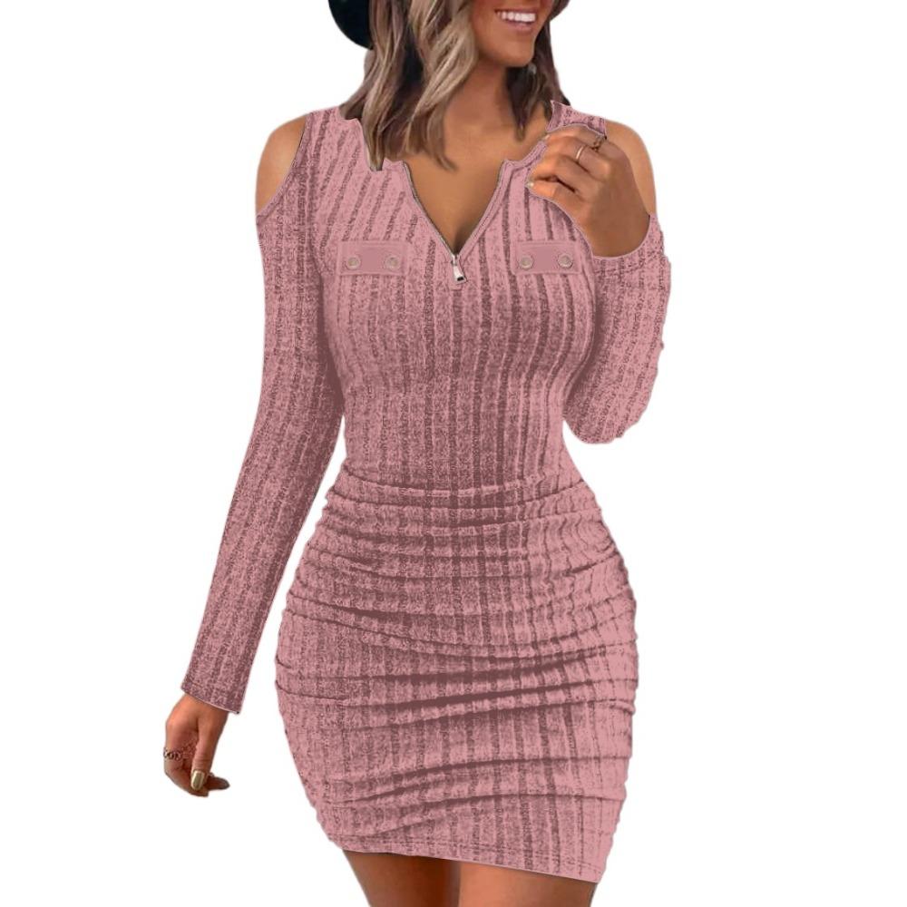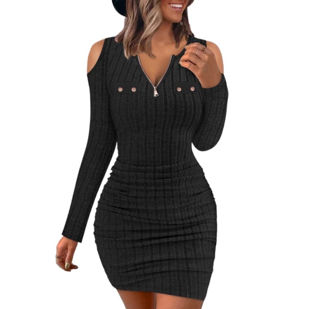 BITCED Женские осенние и зимние однотонные платья с застежкой-молнией и V-образным вырезом, облегающие, с короткими рукавами и тонкими бедрами
